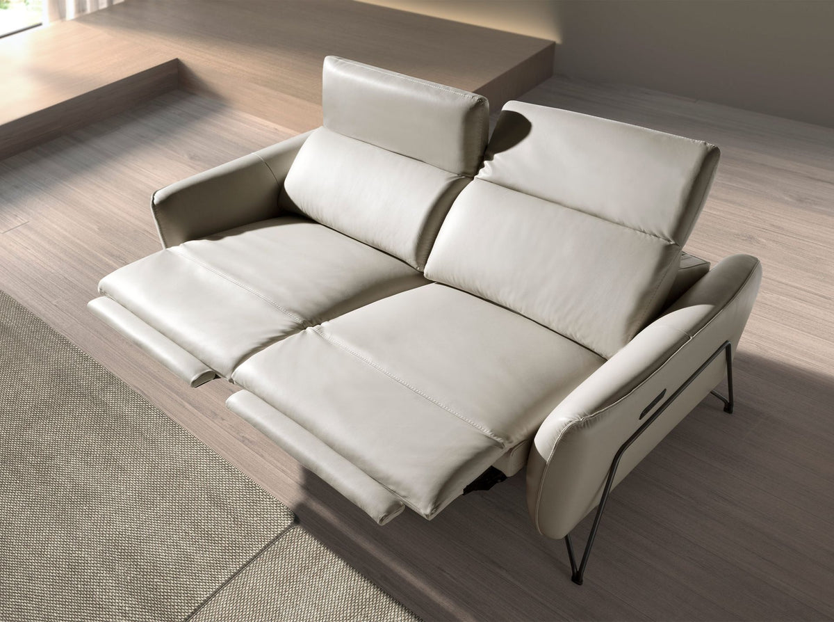 أريكة استرخاء ثلاثية المقاعد بتصميم عصري مكسوة بجلد بقري بلون الرمل مع مسند رأس لضمان راحة أكبر. سواءً من حيث طرازها أو أرجلها المصنوعة من الفولاذ المقاوم للصدأ الداكن، ستضيف هذه الأريكة لمسة الحداثة والأناقة التي تبحث عنها في منزلك. نظاما الاسترخاء الكهربائيان المدمجان فيها يمنحانك الراحة الإضافية التي تحتاجها للاسترخاء.