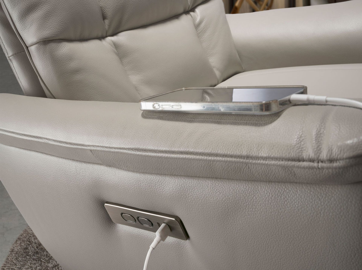 كرسي استرخاء دوار بمساند ذراعين بتصميم عصري، مع مقعد ومسند ظهر مكسوّان بجلد بقري رمادي اللون. سواءً من حيث طرازه أو من حيث قوائمه المصنوعة من الفولاذ المقاوم للصدأ والمطلية بالإيبوكسي الأسود، فإن هذا الكرسي الدوار مزوّد بآلية استرخاء كهربائية، مما يجعله مثاليًا لتحقيق التوازن المثالي بين الأناقة والراحة.