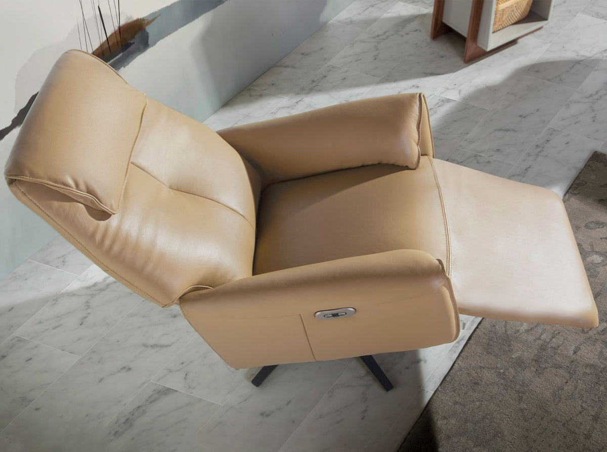 Swivel relax armchair with modern design armrestswith seat and backrest upholstered insand-coloured cowhide leather. Both for its style and itsblack epoxy painted stainless steel legs, thisswivel relax armchair with electric relax mechanismis ideal to provide the perfect balance between style and comfort.