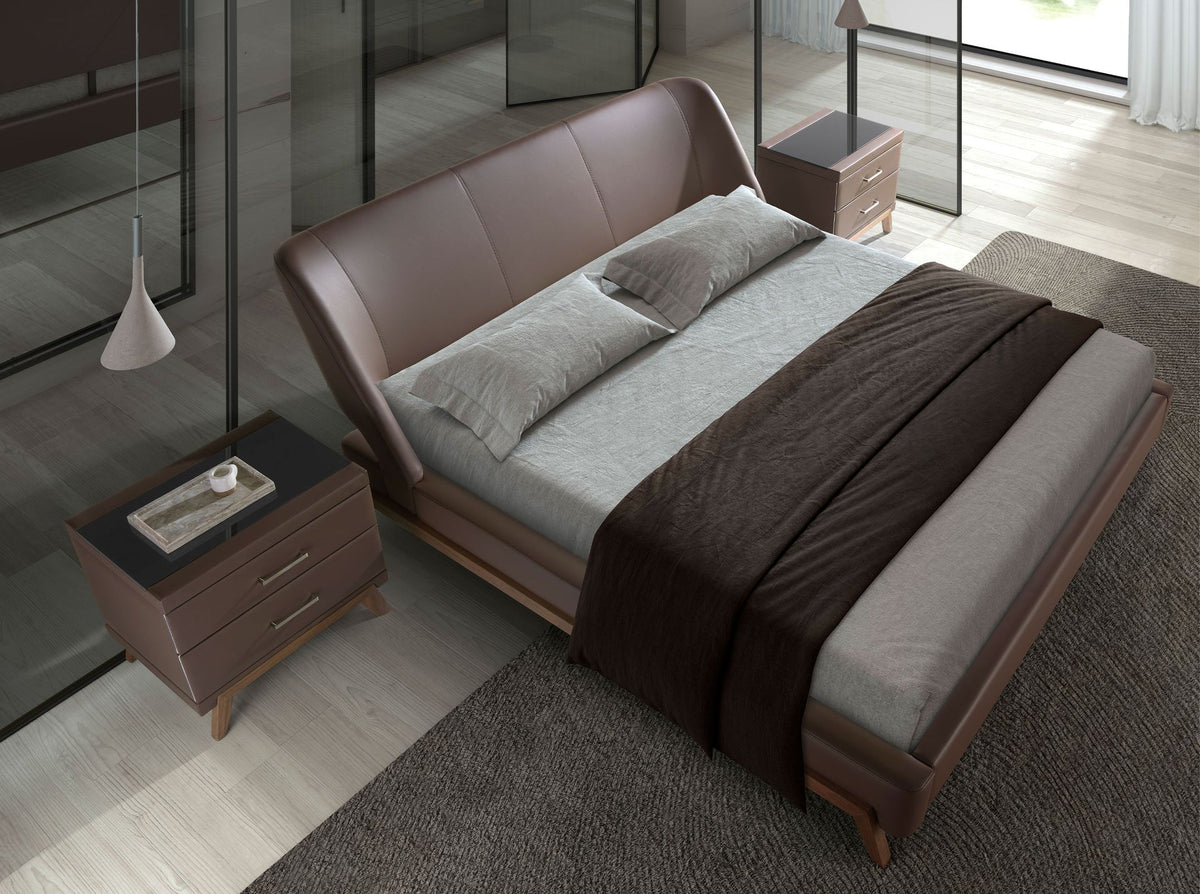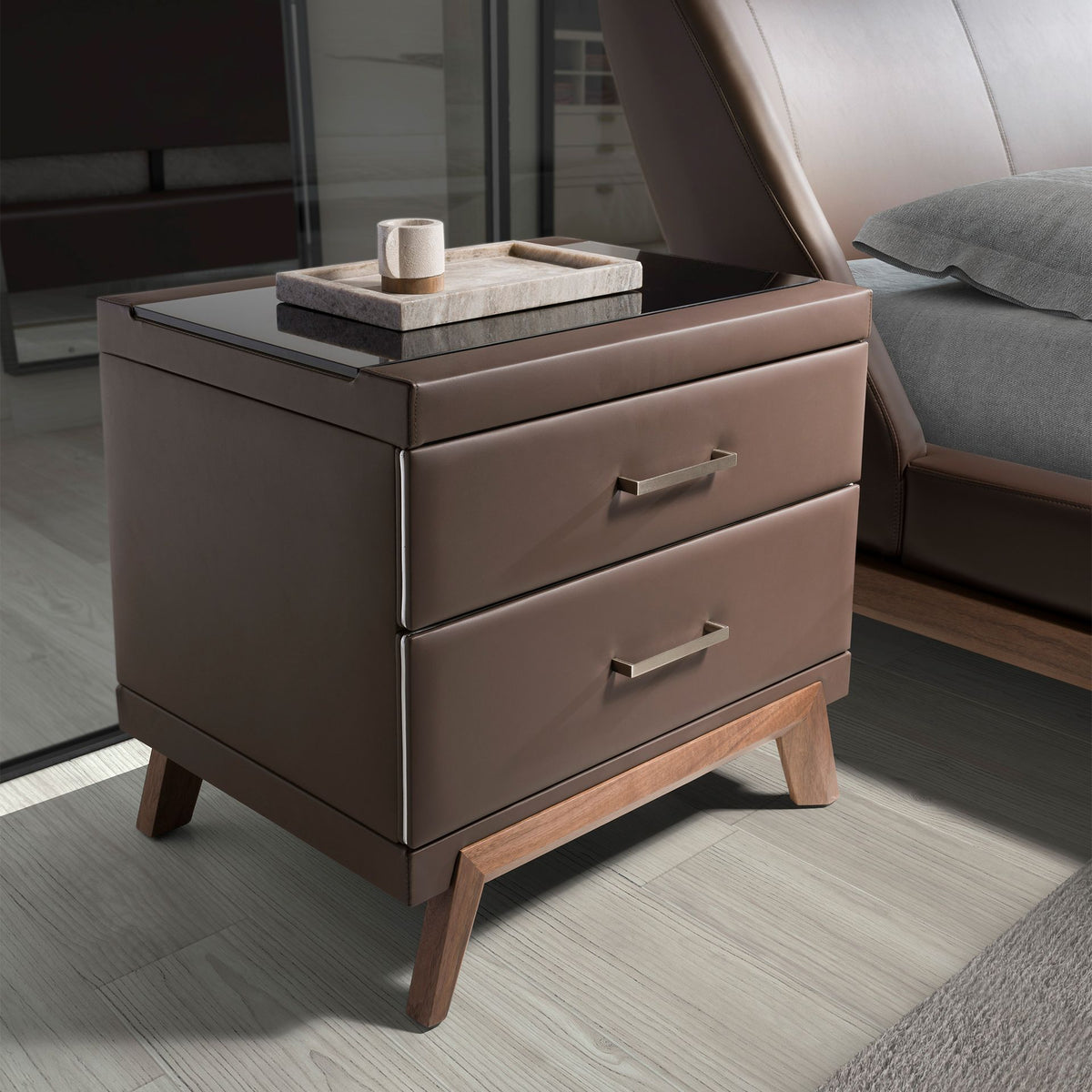 Modern design bedside tablewithnatural walnut veneered woodenstructure upholstered inchocolate brown eatheretteand originalnatural walnut veneered wooden legs. Thanks to its elegantblack tinted glass top, you will get the sophisticated look you are looking for in your rooms. It hasample storage spacewith2 drawerswith apull-tab opening systemandsoft-closing system.