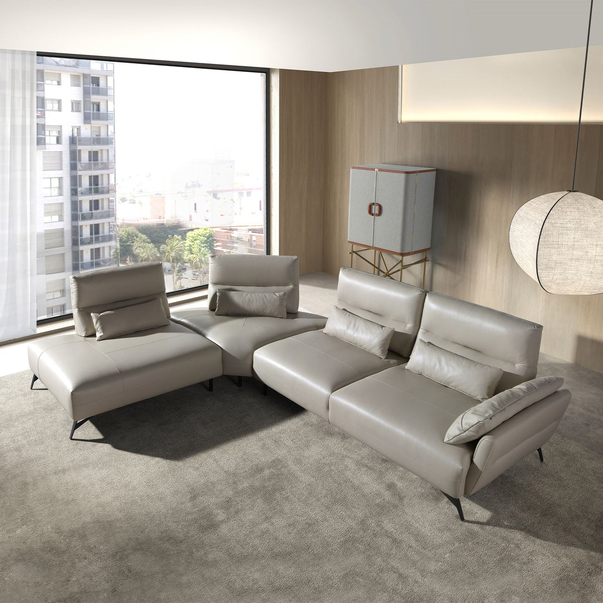 5 seater left chaise longue sofa with a modern designupholstered insand-coloured cowhide leather. Both for its style and itsblack stainless steellegs, this sofa will bring a touch of avant-garde and elegance that you are looking for in your home.