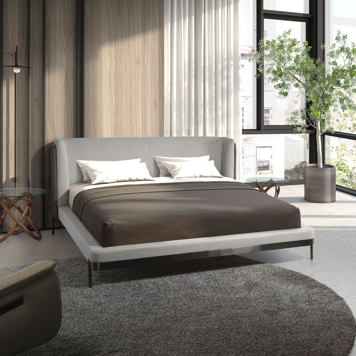 Modern design double bedwith an original headboard and structure made oflight grey fabric, and legs indarkened polished stainless steel. A key piece for your bedroom with which you will provide an elegant and cosy style.Includes a comfortable multi-bed bed basemade of pine wood.