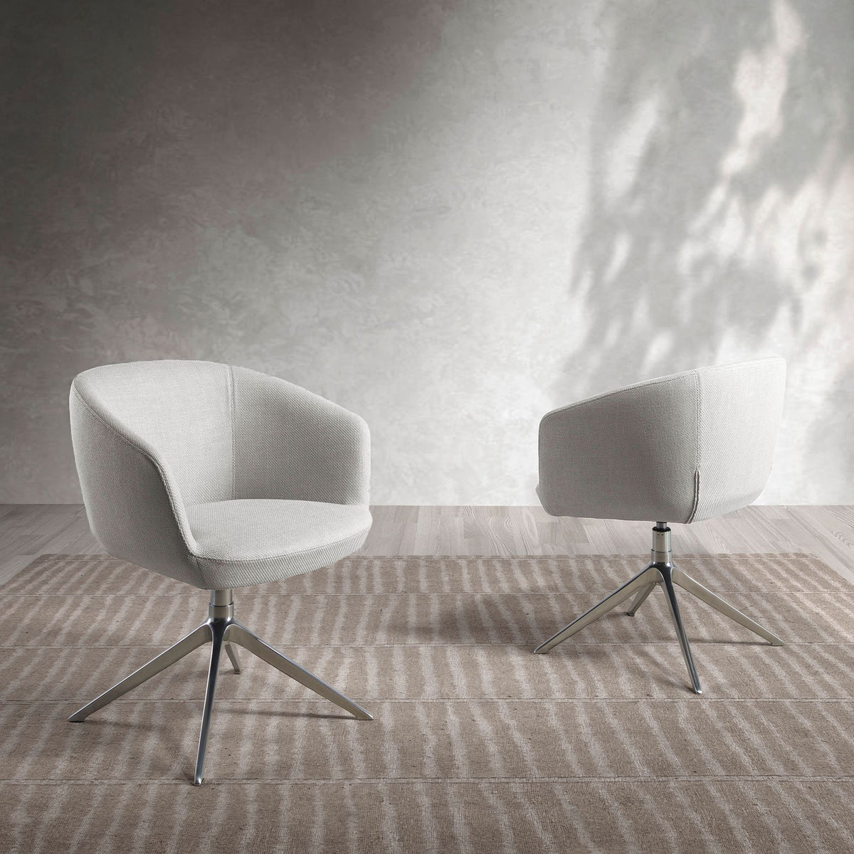 Swivel chair with armrests in a modern designwith seat and backrest upholstered inlight grey fabric. Itschrome-plated stainless steellegs with an avant-garde yet timeless style will make it a must-have for your kitchen or dining room. Thischair by Angel Cerdácombines the unique and personal style of the brand, as well as the highest comfort and stability, thanks to the high quality of its upholstery and the original structure of its legs.