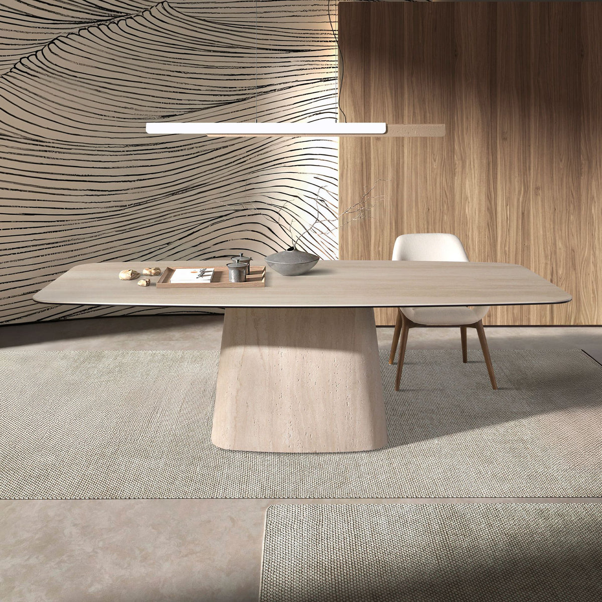 Modern design oval barrel dining tablewith fixed top insand-coloured porcelain marble in matt finish. Its originalwooden legs covered with flexible sand-coloured porcelain marble veneerare key elements of its design.
