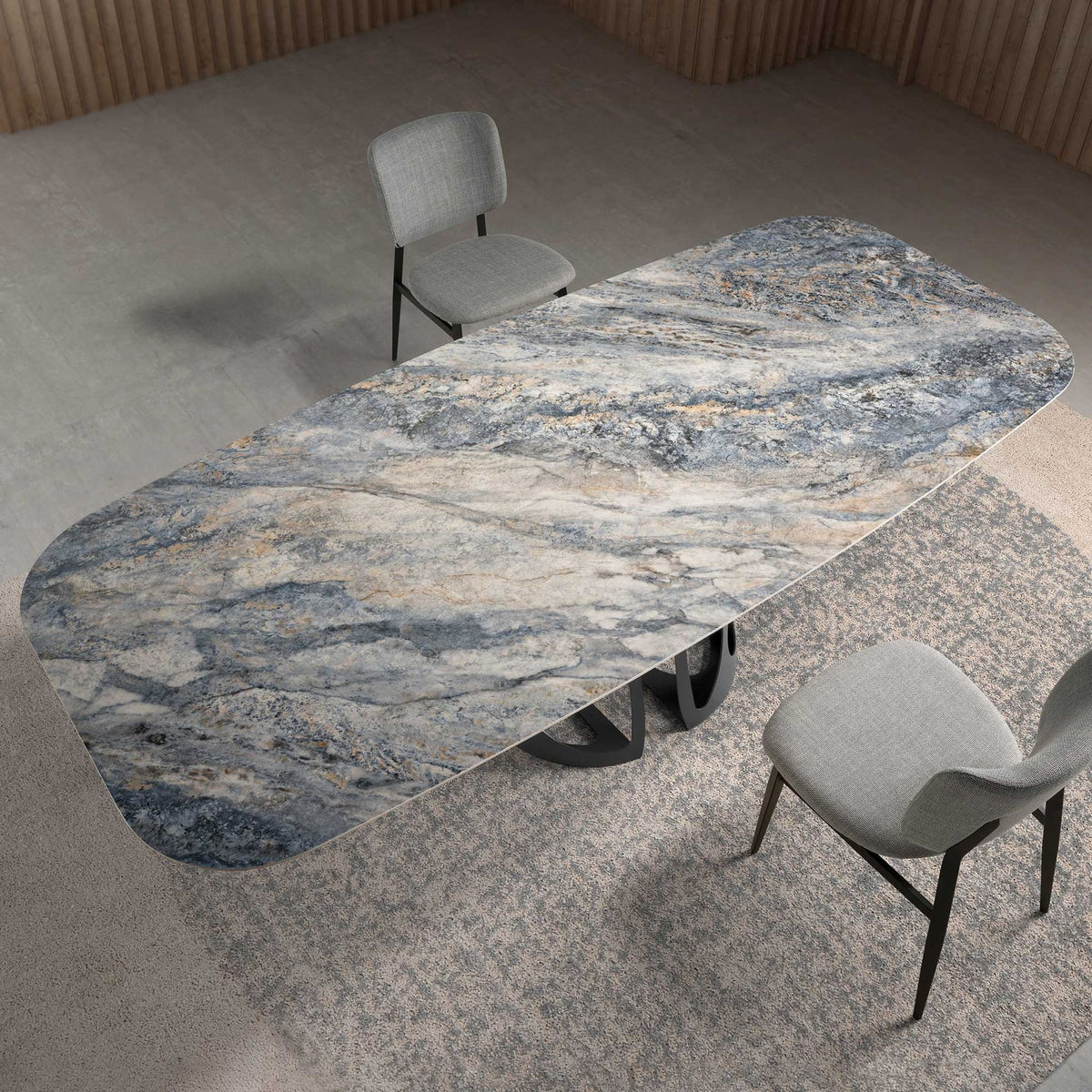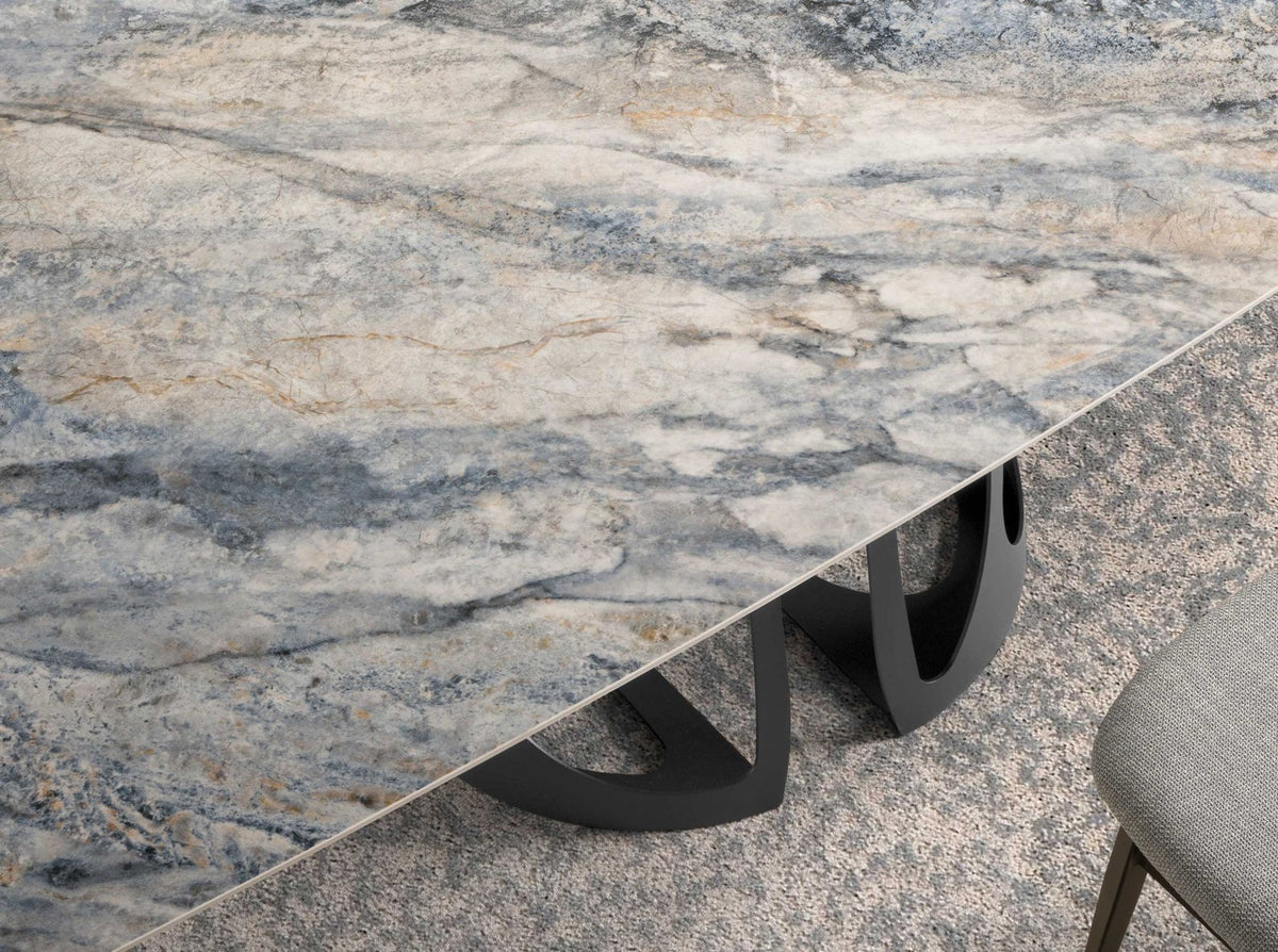 Modern design oval barrel dining tablewith fixed top inblue porcelain marble with grey and brown veins in a glossy finish. Its originalblack epoxy-painted stainless steellegs are key elements of its design.