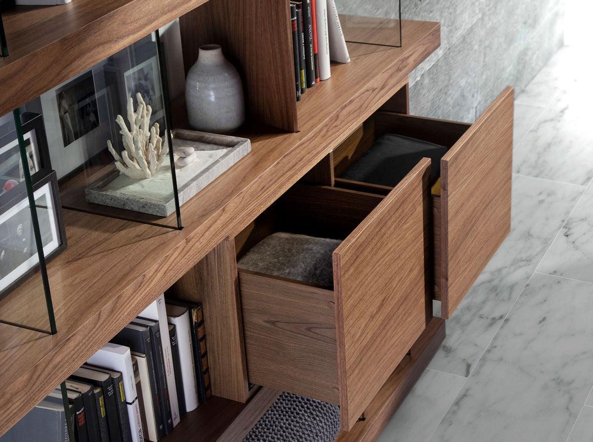 - This original walnut bookcase with a modern design will bring warmth and spaciousness to every room in your home, true to the latest trends in decoration.- Its versatile and functional character allows it to fit in any type of living room, dining room, reading area or office.- All our bookcases are manufactured with the highest quality materials, guaranteeing long-lasting and functional furniture.- Thanks to their straight-lined design and minimalist style, as well as their tempered glass sides, you will get the elegant and personal touch you are looking for in your home.- Both for its size and its large open storage space, this modular shelving is ideal for keeping everything in order and in its place.