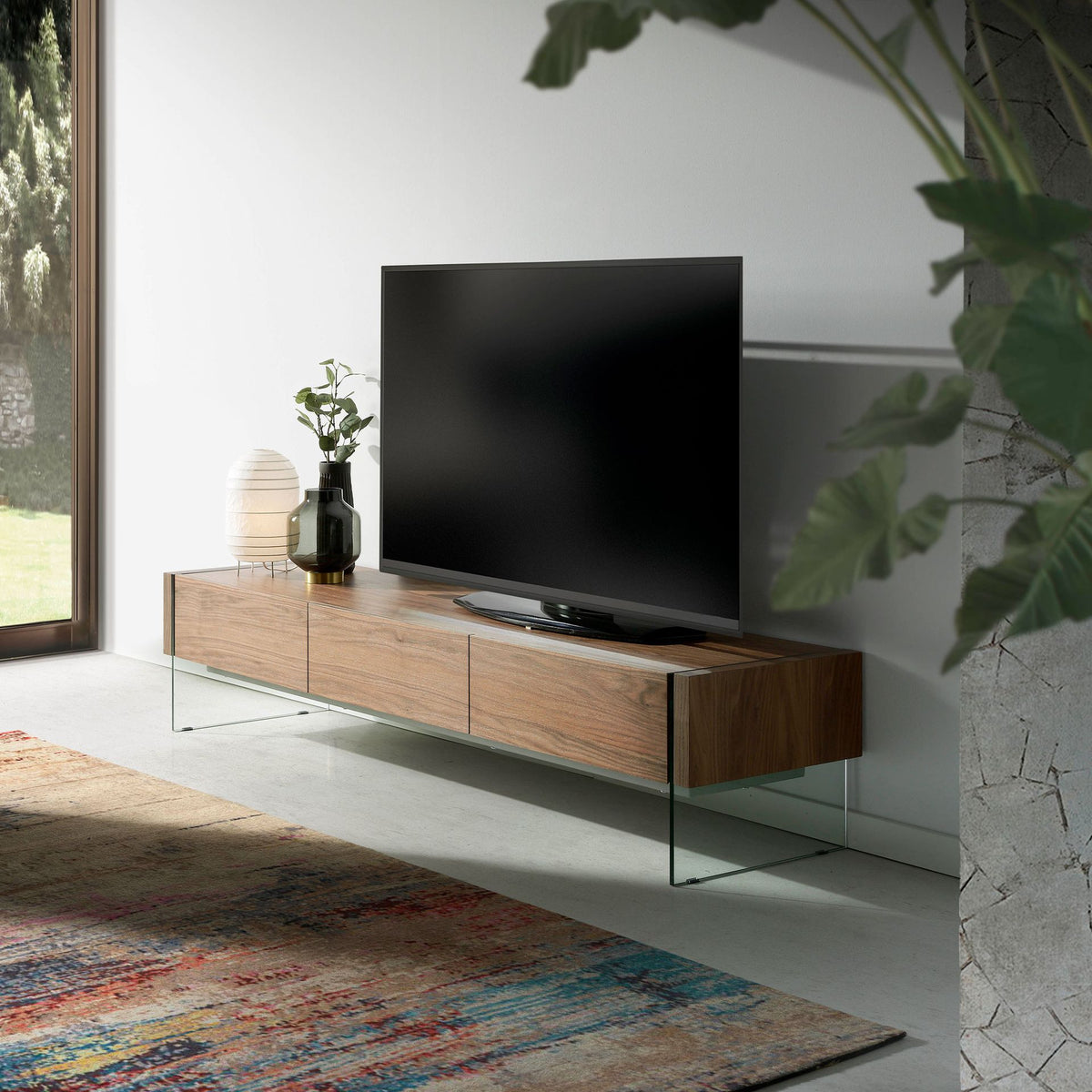 Modern design TV standwithwooden structure in natural walnut veneerandoriginal tempered glasslegs. It has alarge storage spacewith3 drawerswithfingernail opening systemand asoft-closing system.