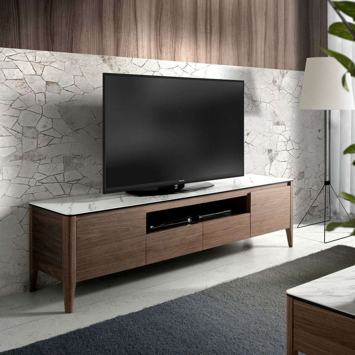 Modern design TV stand with natural walnut veneered wood structure and original walnut coloured wooden legs. Thanks to its elegant glass top imitating white porcelain marble with grey veins in glossy finish, you will get the sophisticated look you are looking for in your rooms. It has a large storage space with 2 drawers with a fingernail opening system and a soft-closing system and 2 doors with a fingernail opening system and a soft-closing system.