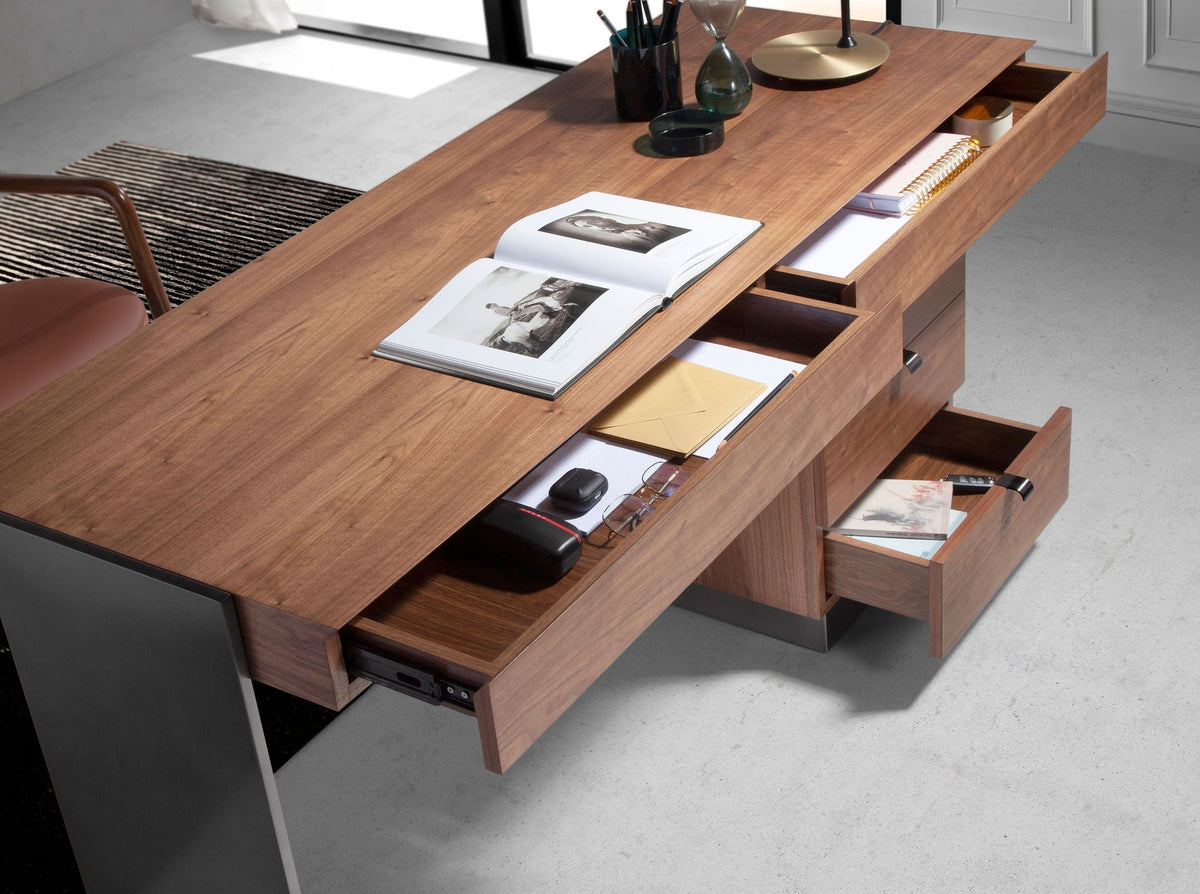 مكتب بتصميم عصري بسطح وهيكل من قشرة الجوز الطبيعي. سيضفي تصميم أرجله المصنوعة من الفولاذ المقاوم للصدأ المصقول والمُعتم لمسة راقية وحصرية لغرفتك. بفضل مساحة التخزين الواسعة التي يوفرها مع 5 أدراج بنظام الإغلاق اللطيف، سيمكنك من الحفاظ على كل شيء مرتبًا وفي مكانه.
