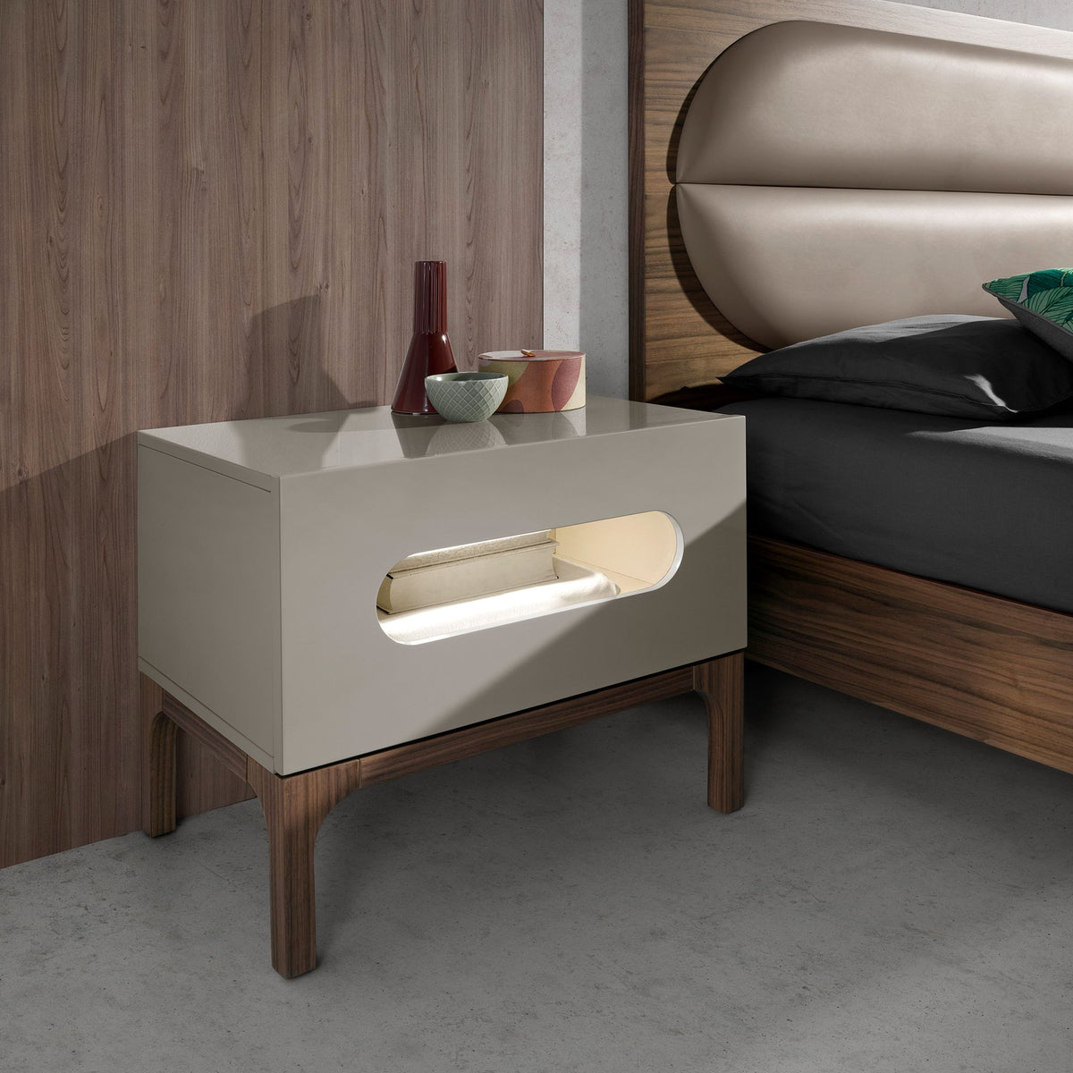 طاولة سرير رمادية وخشب جوز مع إضاءة داخلية