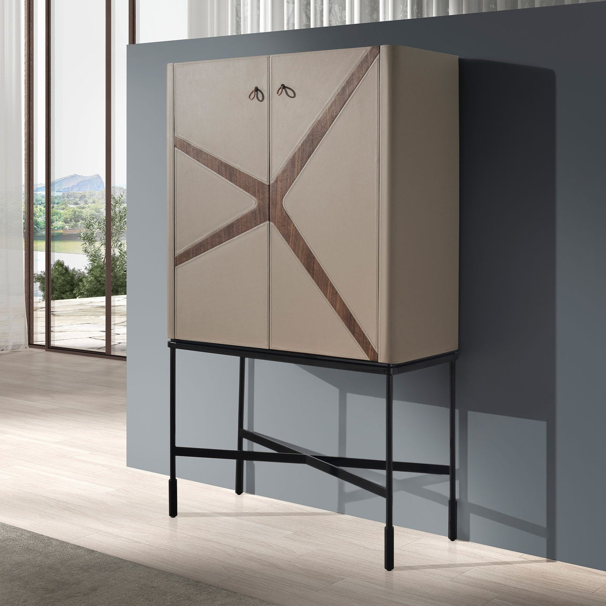 خزانة جانبية عالية من الجلد والجوز والفولاذ الأسود