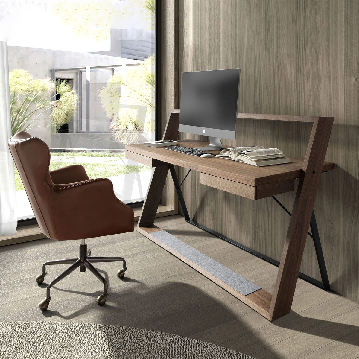 مكتب بتصميم عصري مصنوع من خشب قشرة الجوز الطبيعي. تصميم أرجل قشرة الجوز الطبيعي سيمنح غرفتك لمسة راقية وحصرية. بفضل مساحة التخزين الواسعة مع درجين يغلقان بانسيابية، يمكنك الحفاظ على كل شيء مرتبًا وفي مكانه.