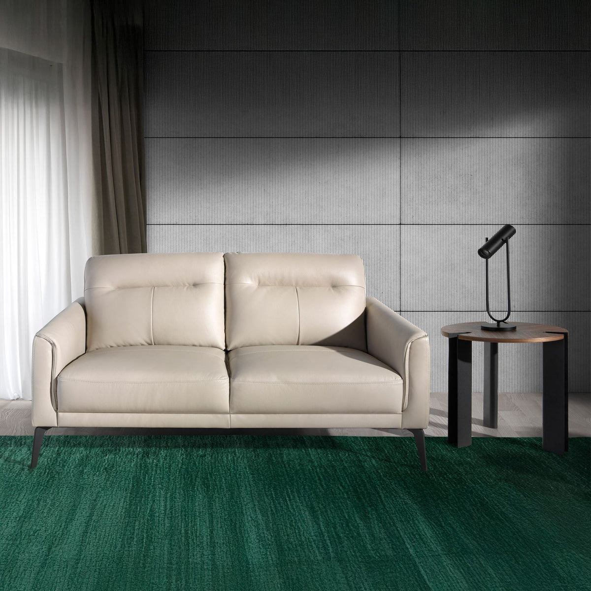 2-seater sofa with a modern design upholstered in taupe grey cowhide leather. Both for its style and for its black epoxy painted stainless steel legs, this sofa will bring a touch of avant-garde and elegance that you are looking for in your home.