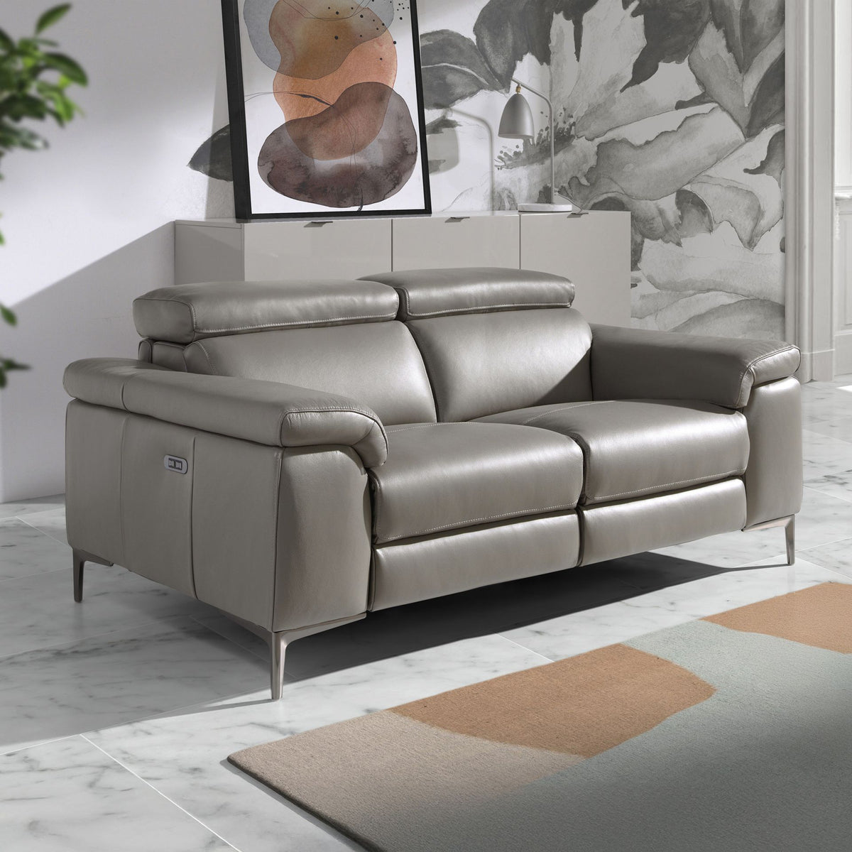 Modern design 2 seater relaxation sofa upholstered in dark grey cowhide leather with headrest for extra comfort. Both for its style and its darkened stainless steel legs, this sofa will bring a touch of avant-garde and elegance that you are looking for in your home.Its 2 electric relaxation systems give you the extra comfort you need to relax.
