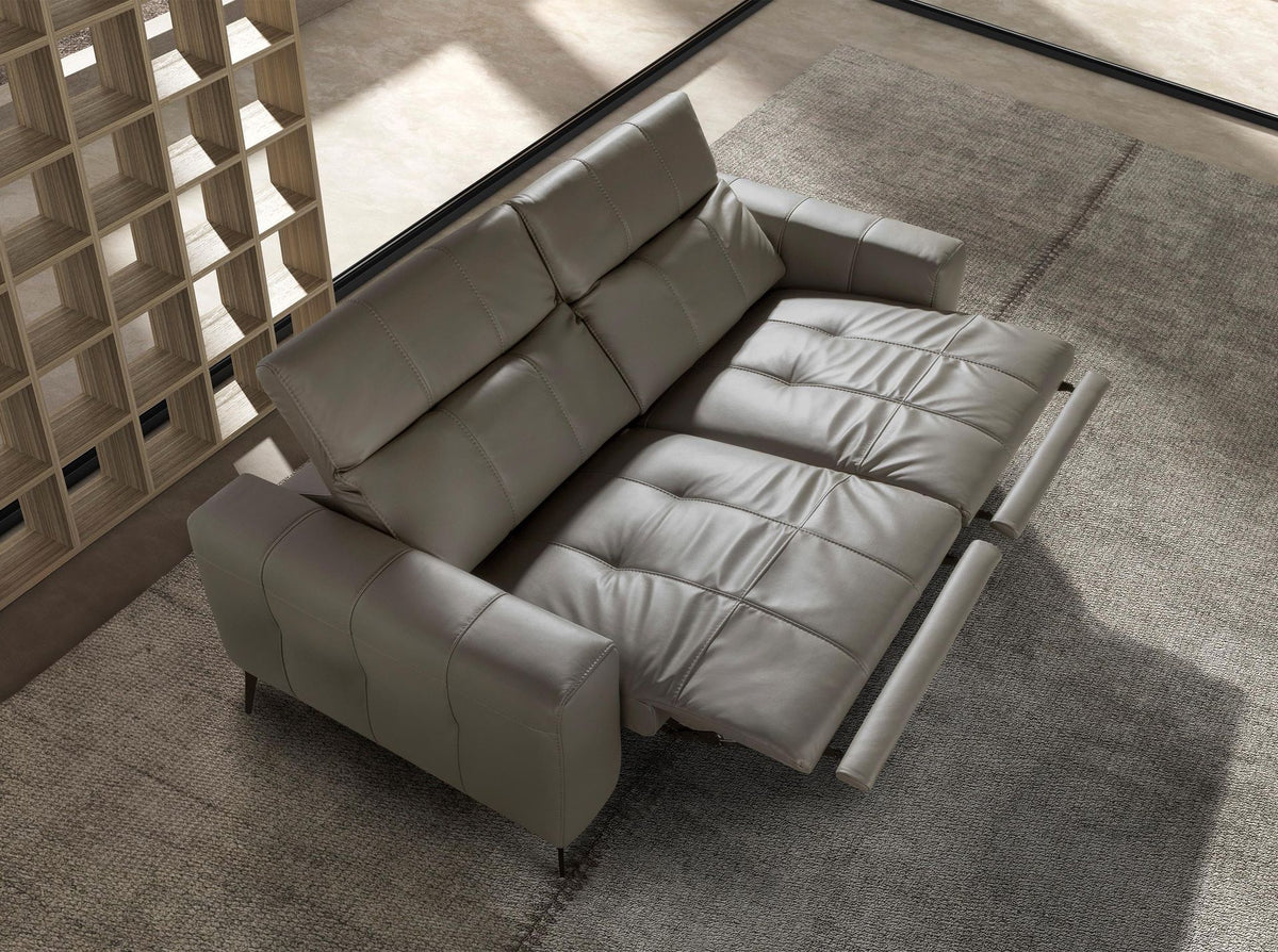 2-seater relaxation sofa with a modern design upholstered in grey cowhide leather with headrest to guarantee greater comfort. Both for its style and its black epoxy painted stainless steel legs, this sofa will bring a touch of avant-garde and elegance that you are looking for in your home.Its 2 electric relaxation systems provide the extra comfort you need to relax.
