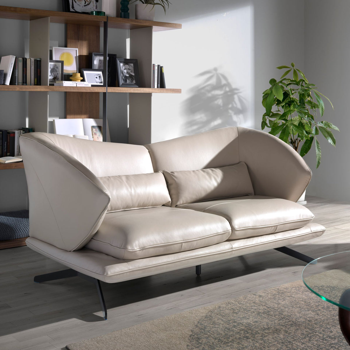 2 seater sofa of modern design upholstered in taupe grey cowhide leather. Both for its style and for its black stainless steel legs, this sofa will bring the touch of avant-garde and elegance you are looking for for your home.