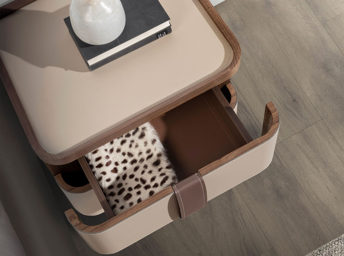 Modern design bedside tablewithnatural walnut veneered woodstructure upholstered inmink-coloured cowhide leatherand an originalpolished stainless steel base. It has alarge storage spacewith2 drawerswithpull-tab opening system and soft-closing system.