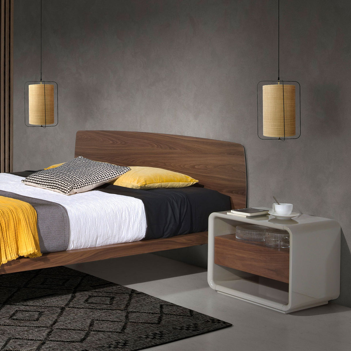 Modern design bedside tablewithwooden structure veneered in natural walnutand anoriginal grey MDF wooden base. It has alarge storage spacewith1 drawerwithfingernail opening systemandsoft-closing system.
