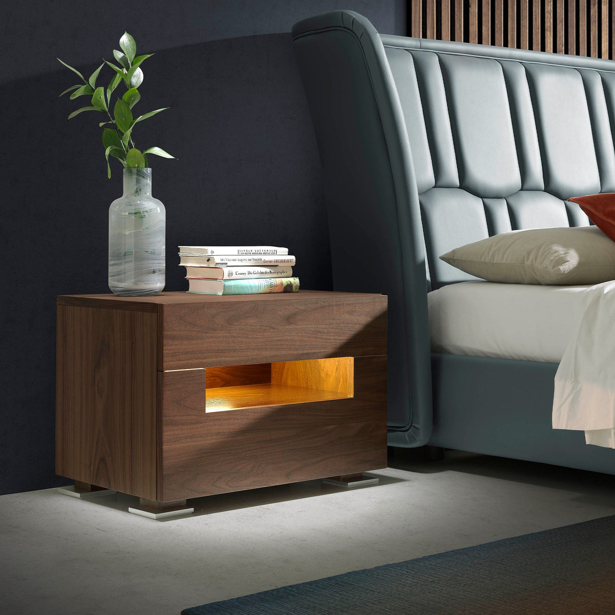 Modern design bedside table with natural walnut veneered wood structure and original polished stainless steel legs. The interior lighting of this bedside table will allow you to create a warm and relaxed atmosphere, while offering a better view of the inside of the furniture. It has a large storage space with 2 drawers with fingernail opening system and soft-closing system.