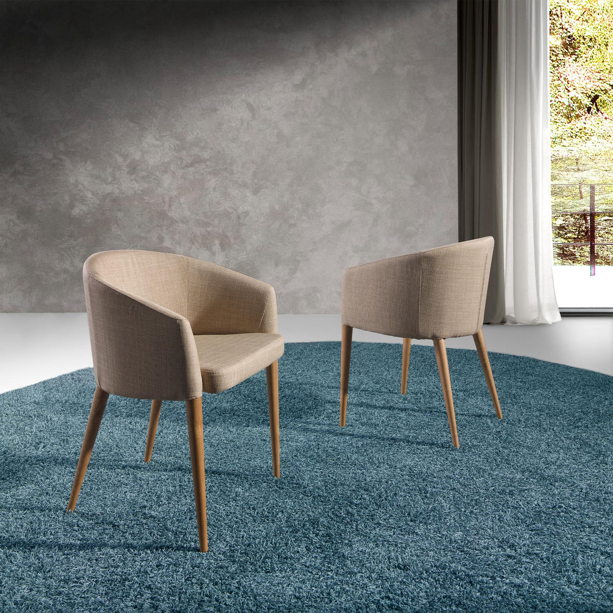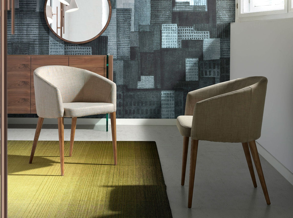 Chair with armrests in a modern designwith seat and backrest upholstered inbeige fabric. Itswalnut-coloured woodenlegs in an avant-garde yet timeless style will make it a must-have for your kitchen or dining room. Thischair by Angel Cerdácombines the unique and personal style of the brand, as well as the highest comfort and stability, thanks to the high quality of its upholstery and the original structure of its legs.