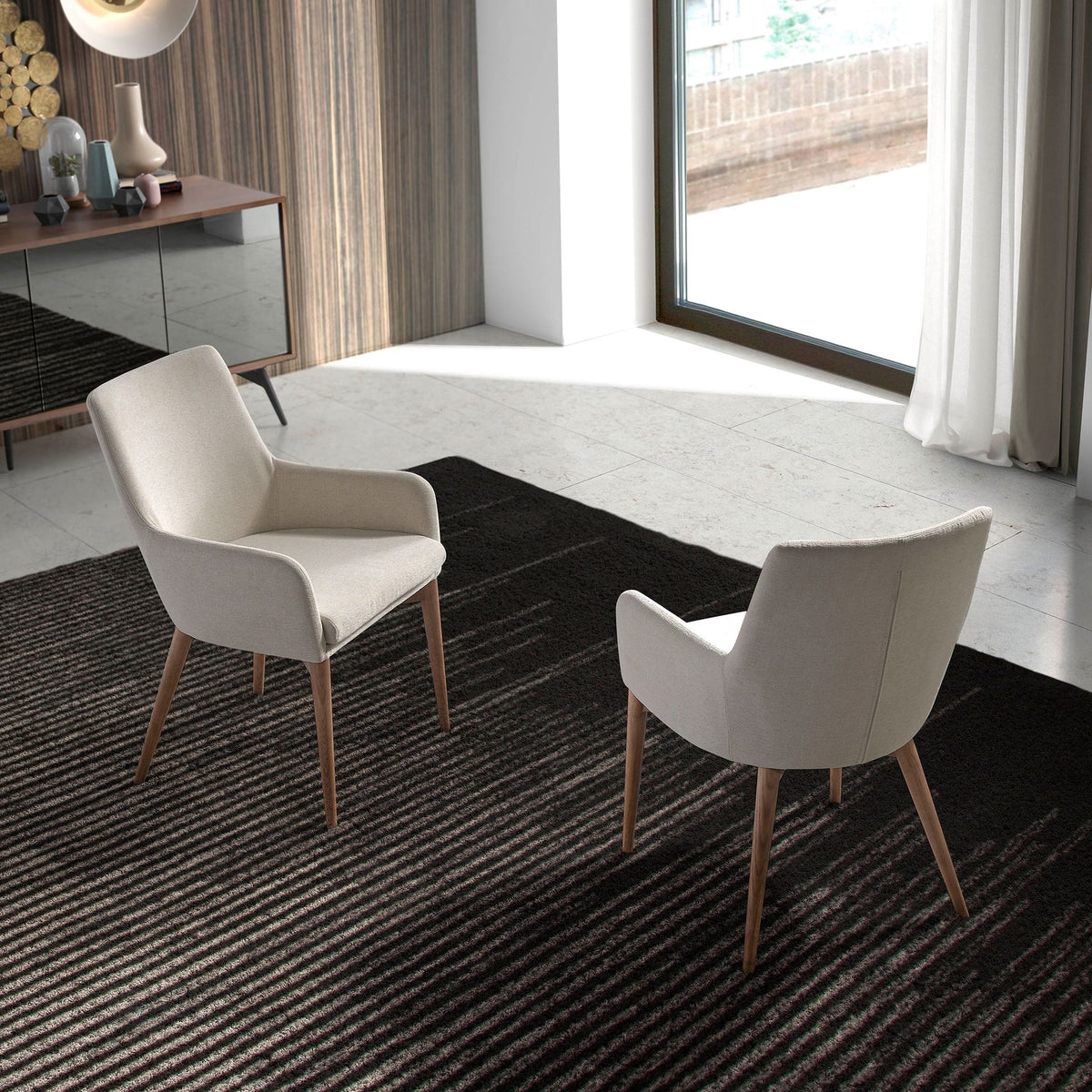 Chair with armrests in a modern designwith seat and backrest upholstered inbeige fabric. Itswalnut-coloured woodenlegs in an avant-garde yet timeless style will make it a must-have for your kitchen or dining room. Thischair by Angel Cerdácombines the unique and personal style of the brand, as well as the highest comfort and stability, thanks to the high quality of its upholstery and the original structure of its legs.