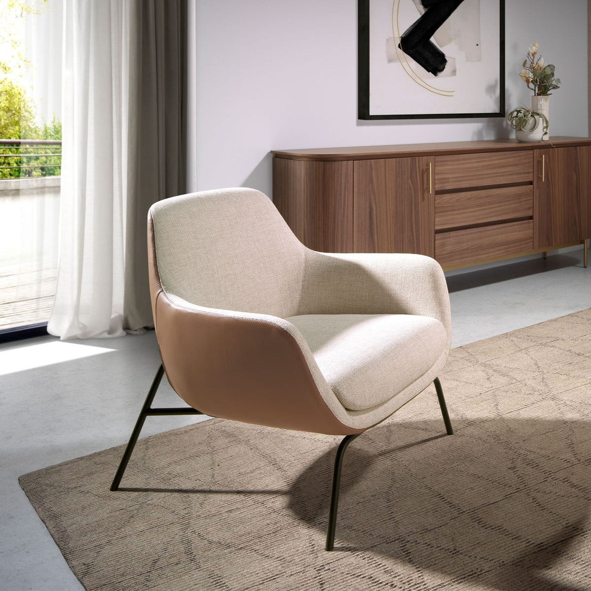 Armchair with armrests of modern designwith seat upholstered incream fabricand back upholstered inbrown leatherette. Both for its style and itsblack stainless steellegs, this armchair is the perfect combination between design and comfort.