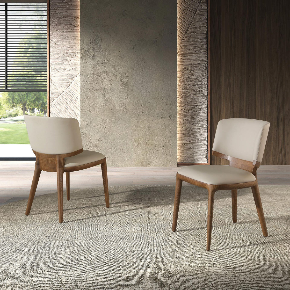 Modern design chairwith seat and back upholstered incream leatherette. Itswalnut-coloured woodenlegs in an avant-garde yet timeless style will make it a must-have for your kitchen or dining room. Thischair by Angel Cerdácombines the unique and personal style of the brand, as well asthe highest comfort and stability, thanks to the high quality of its upholstery and the original structure of its legs.