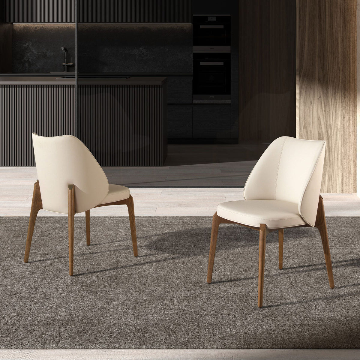 Modern design chairwith seat and backrest upholstered incream leatherette. Both itspolished stainless steel details in golden colourand itsnatural walnut veneered woodenlegs with an avant-garde yet timeless style will make it a must-have for your kitchen or dining room. Thischair by Angel Cerdácombines the unique and personal style of the brand, as well asthe greatest comfort and stability, thanks to the high quality of its upholstery and the original structure of its legs.
