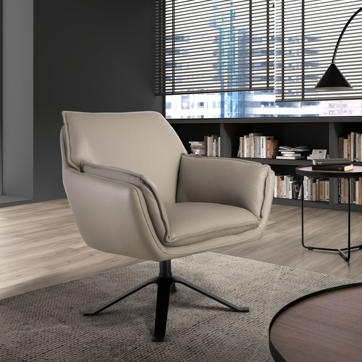 Modern design swivel armchairwith seat and backrest upholstered indark grey cowhide leather. Both its style and itsblack stainless steellegs make this swivel armchair the perfect combination of design and comfort.