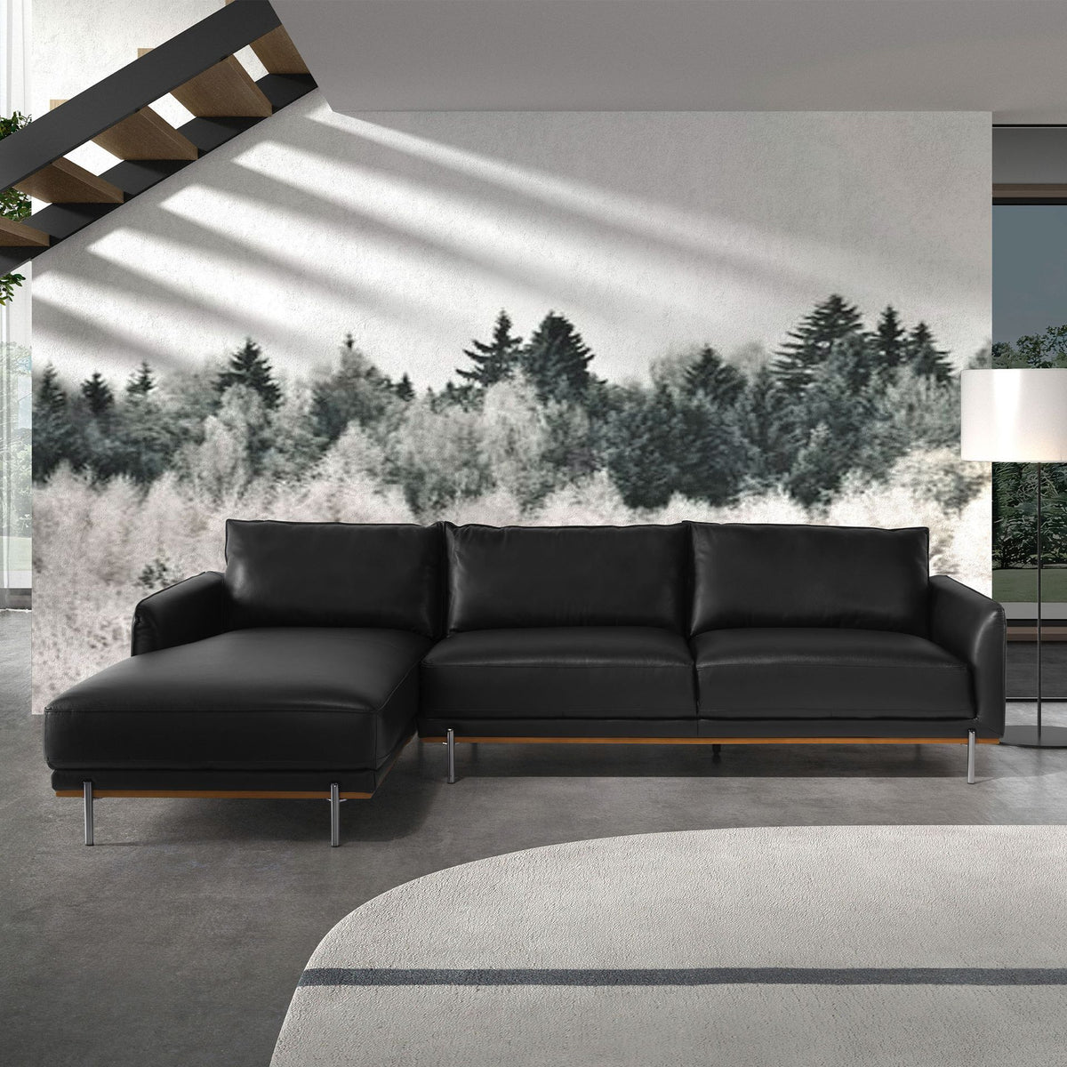 5 seater left chaise longue sofa with a modern design upholstered in black cowhide leather. Both for its style and for its walnut-coloured steamed beech wood trim and darkened stainless steel legs, this sofa will bring the touch of avant-garde and elegance you are looking for in your home.
