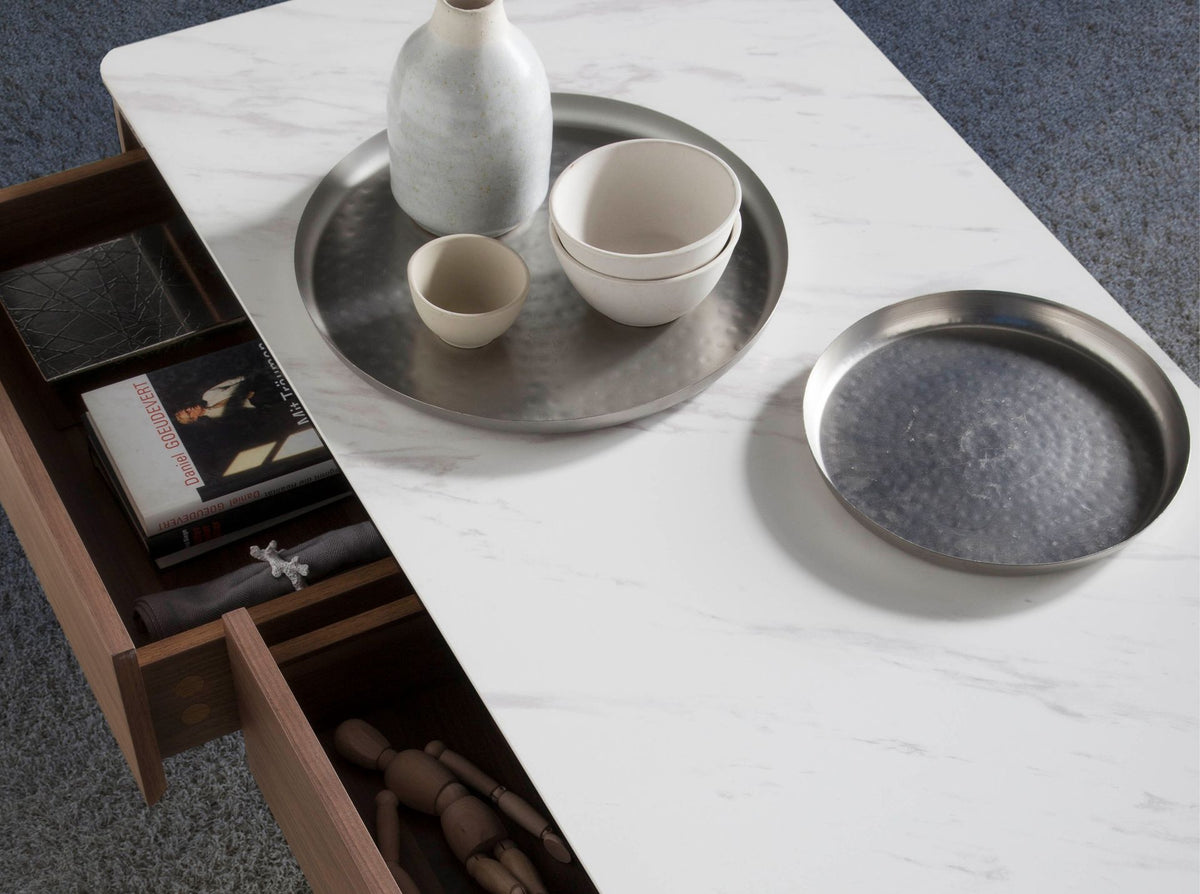 Rectangular coffee table with a modern designmade ofnatural walnut veneered woodand an elegantwhite porcelain marble top with grey veins in a glossy finish.