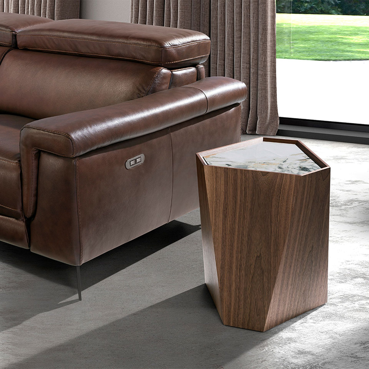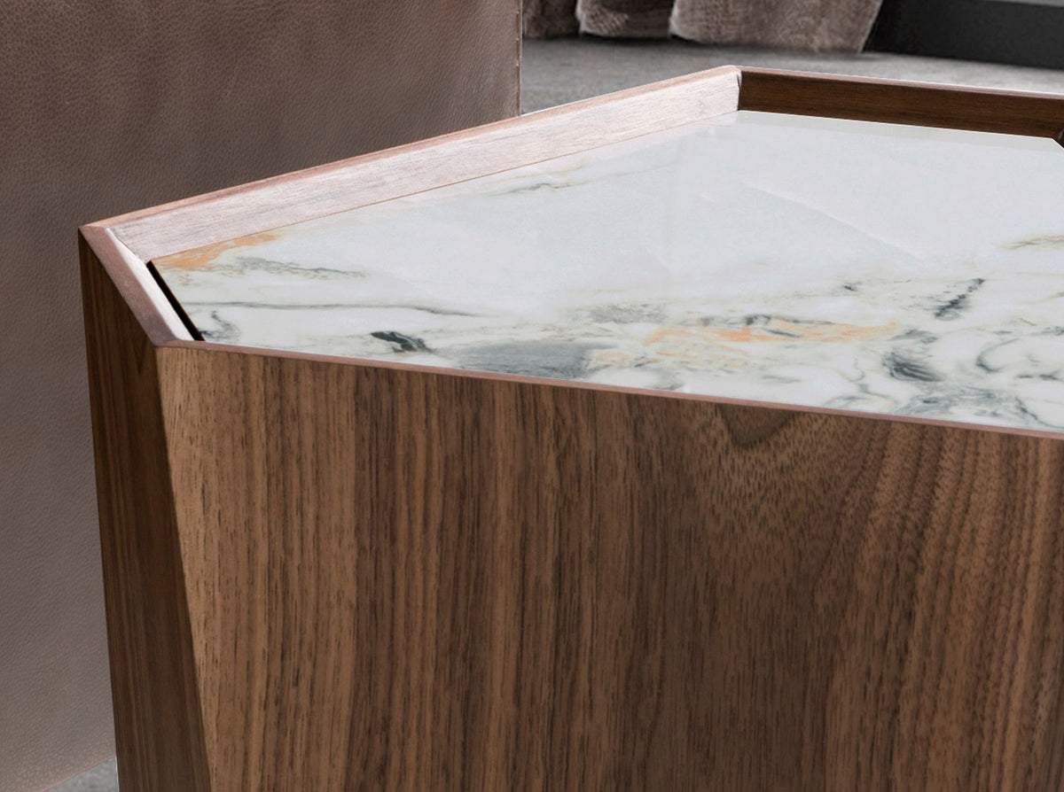 Triangular corner table with a modern designmade ofnatural walnut veneered woodand an elegantwhite porcelain marble top with grey and brown veins in a glossy finish.