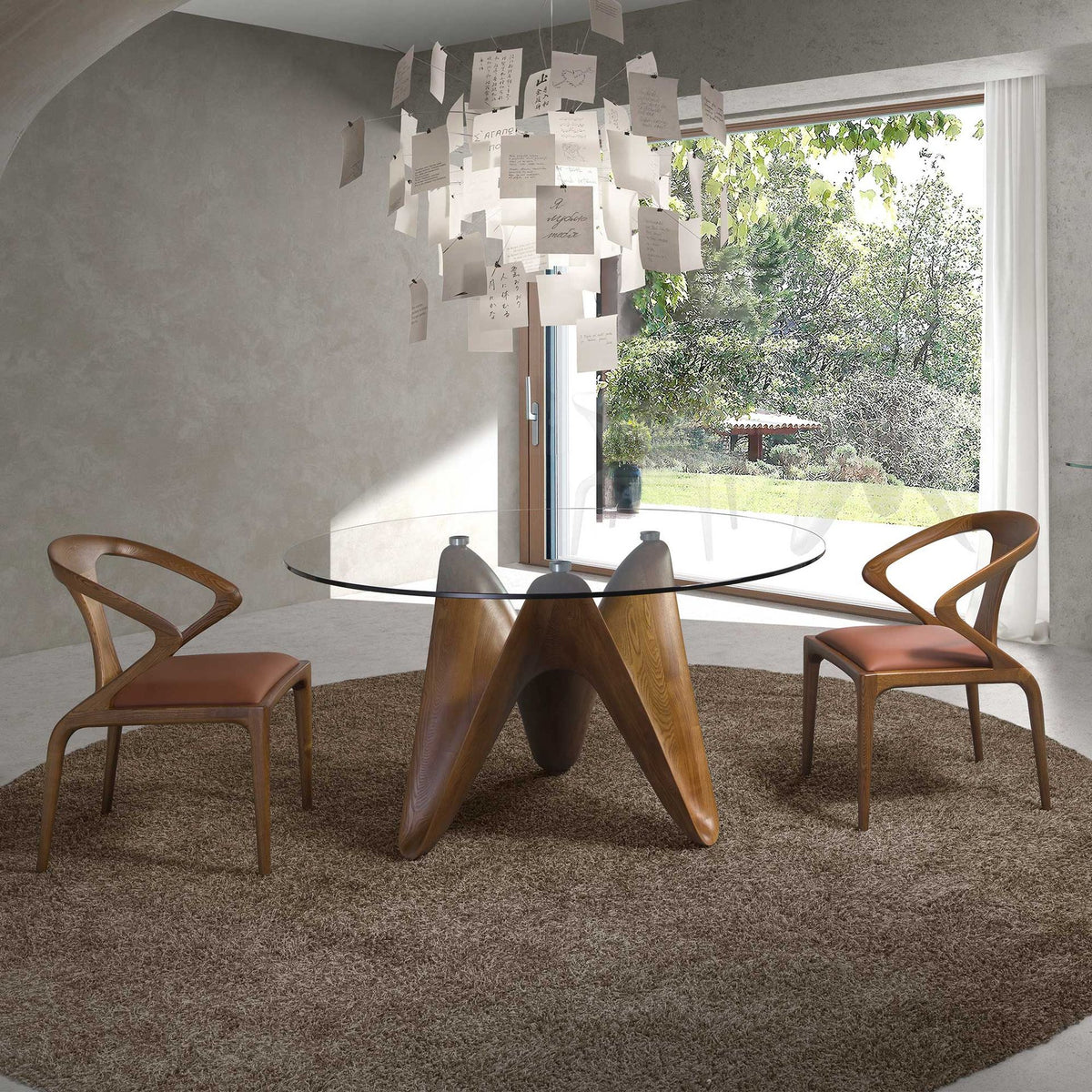 Modern round dining tablewith fixedtempered glass top. Its originalwalnut-coloured wooden legsare key elements of its design.