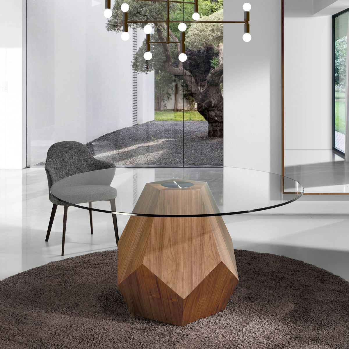 Modern round dining table with fixed tempered glass top. Its original natural walnut veneered wooden legs are key elements to highlight its design.