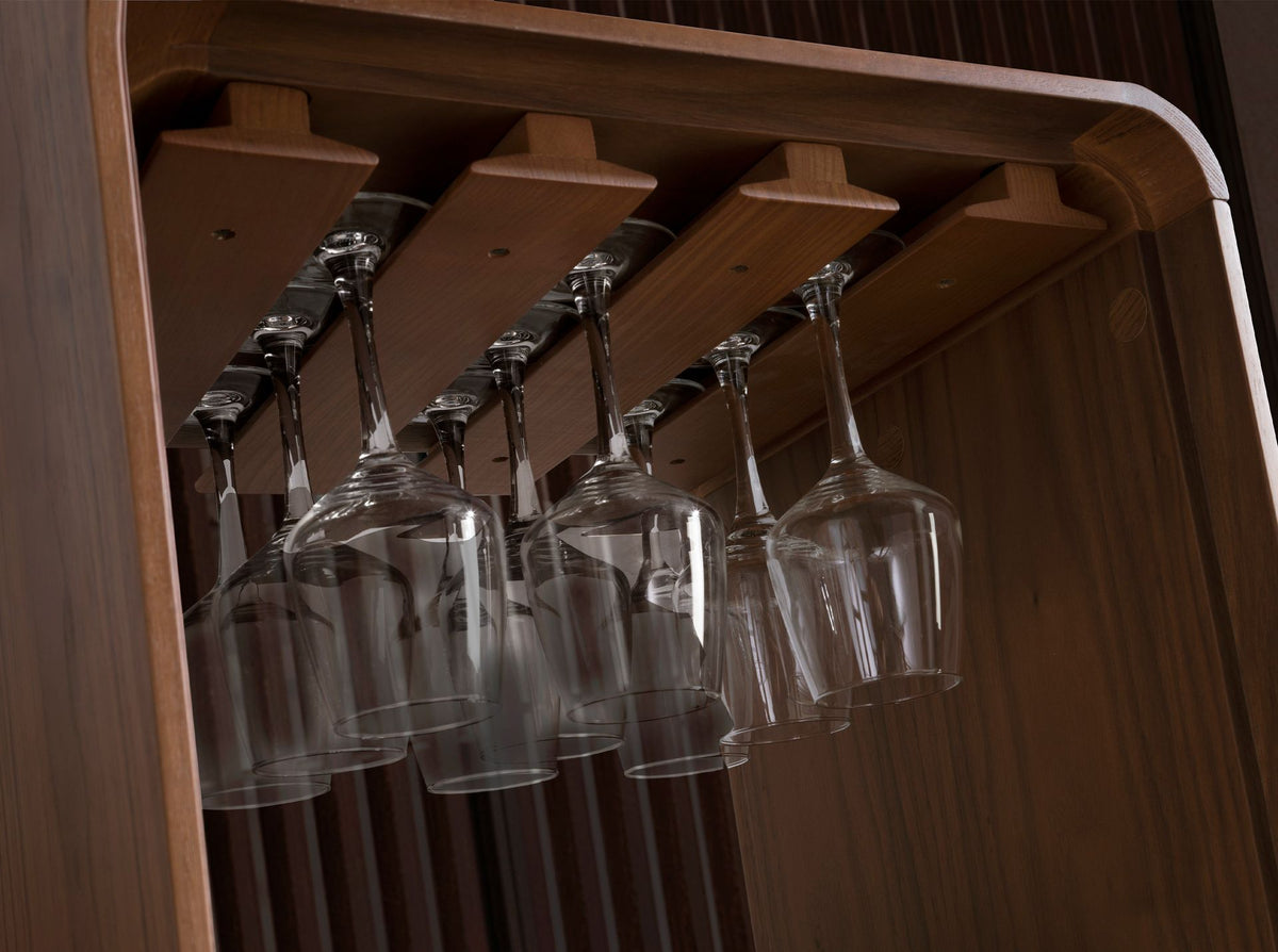 360º rotating circular barunit made ofwalnut veneered woodwith 3 side drawers. It has upper slats ofsolid ash woodwith support for glasses and lower space for 6 bottles.