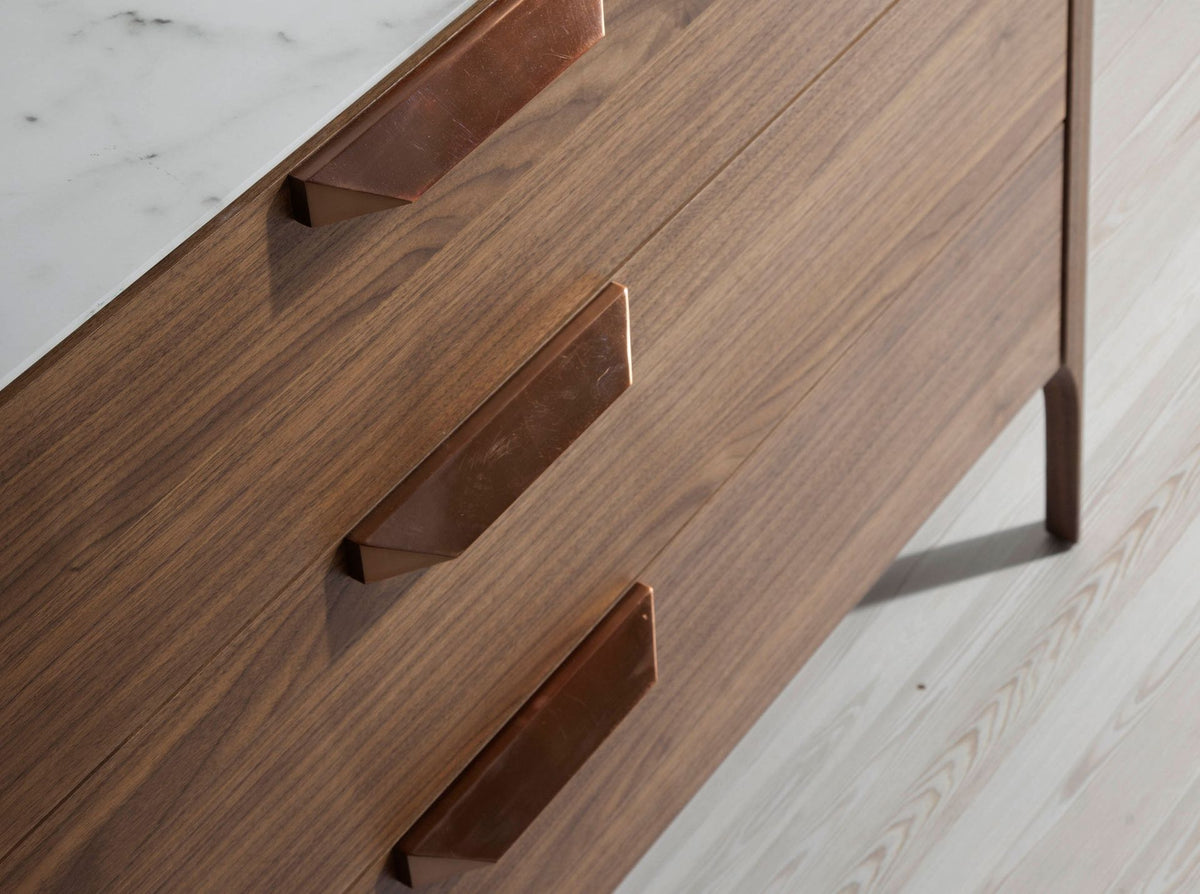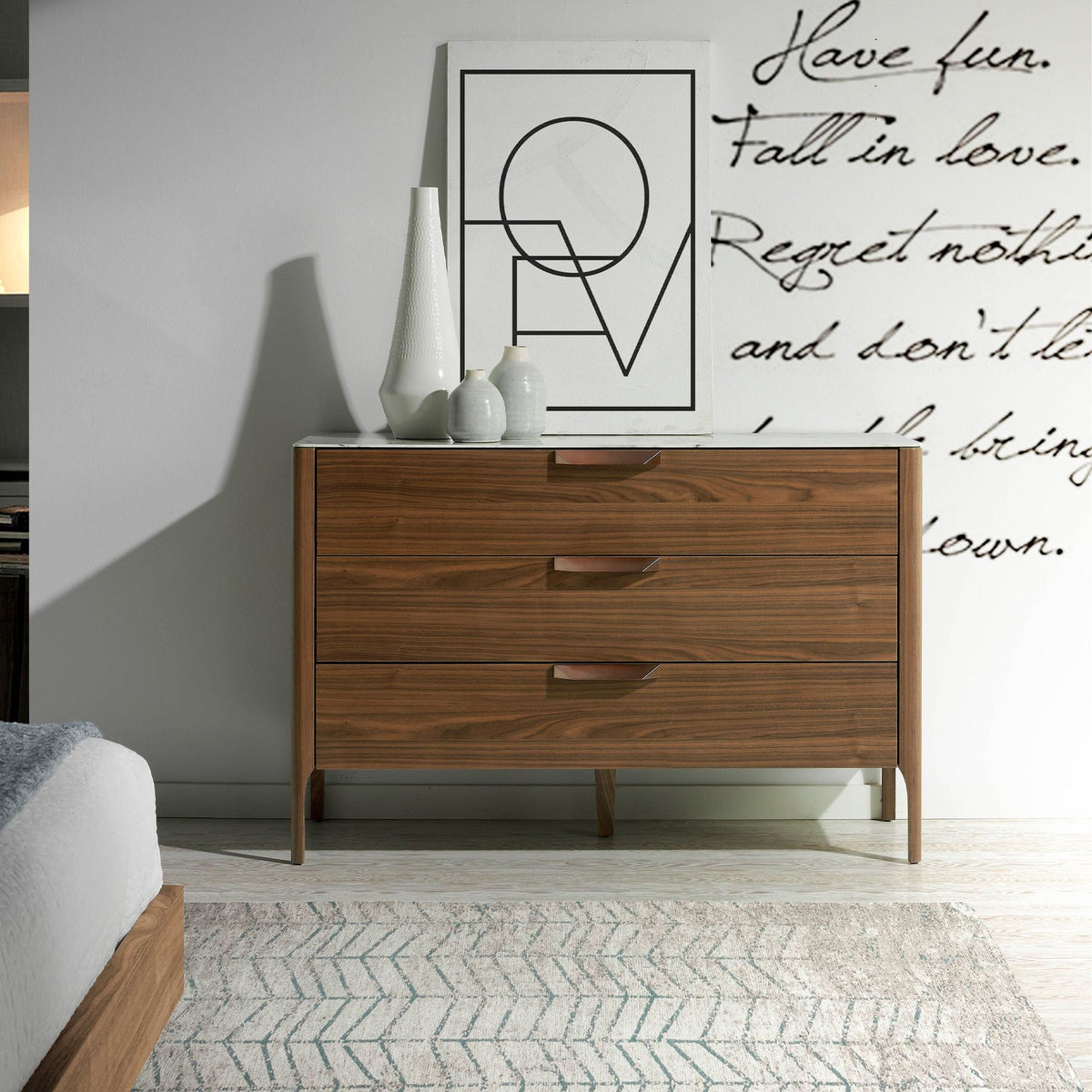 Chest of drawers with a modern design with a natural walnut veneered wooden structure and original natural walnut veneered wooden legs. Thanks to its elegant glass top imitating white porcelain marble with grey veins in glossy finish, you will get the sophisticated look you are looking for in your rooms. It has ample storage space with 3 drawers with a pull-tab opening system and soft-closing system.