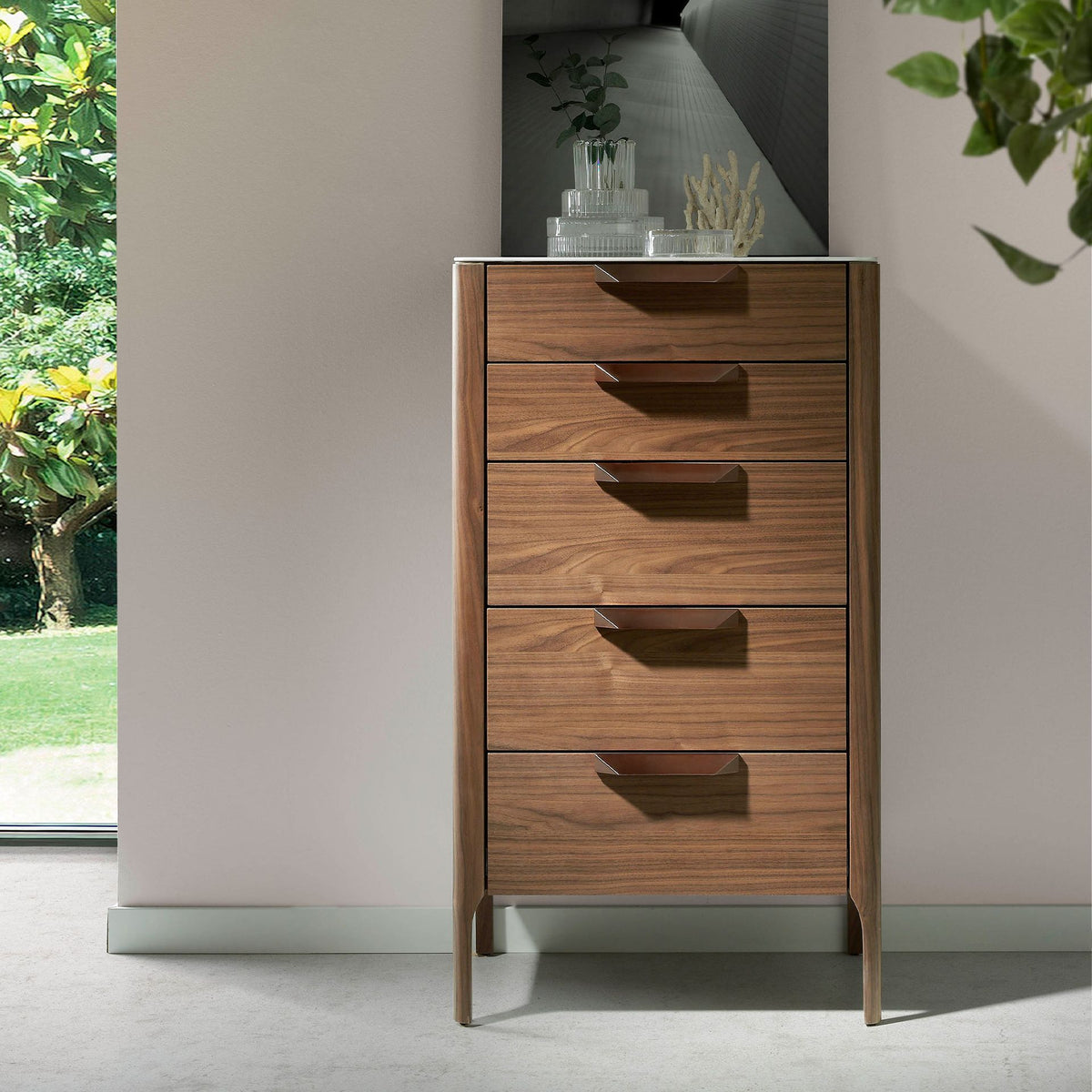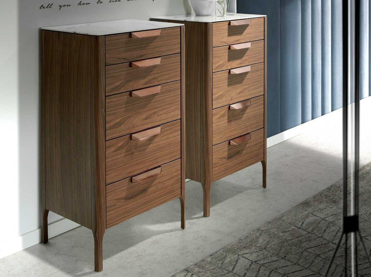 Modern design chiffonier with a wooden structure veneered in natural walnut and original wooden legs veneered in natural walnut. Thanks to its elegant glass top imitating white porcelain marble with grey veins in glossy finish, you will get the sophisticated look you are looking for in your rooms. It has a large storage space with 5 drawers with pull-tab opening system and soft-closing system.