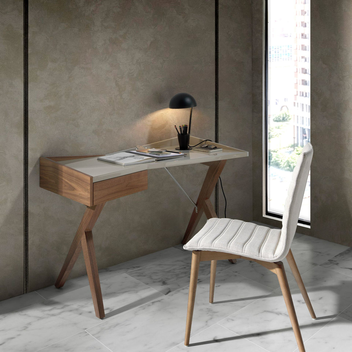 Modern design desk with grey MDF top and natural walnut veneered wood structure. The design of its natural walnut veneered wooden legs will bring a sophisticated and exclusive touch to your room. Thanks to its ample storage space with 1 drawer with a soft-closing system, it will allow you to keep everything in order and in its place.