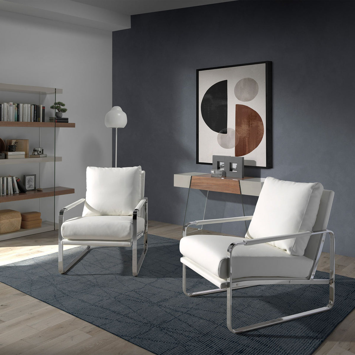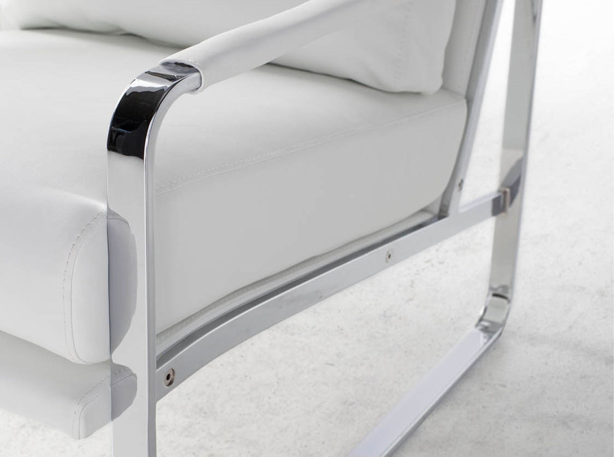 Armchair with modern design armrestswith seat and backrest upholstered inwhite leatherette. Both for its style and itschromed stainless steellegs, this armchair is the perfect combination of design and comfort.
