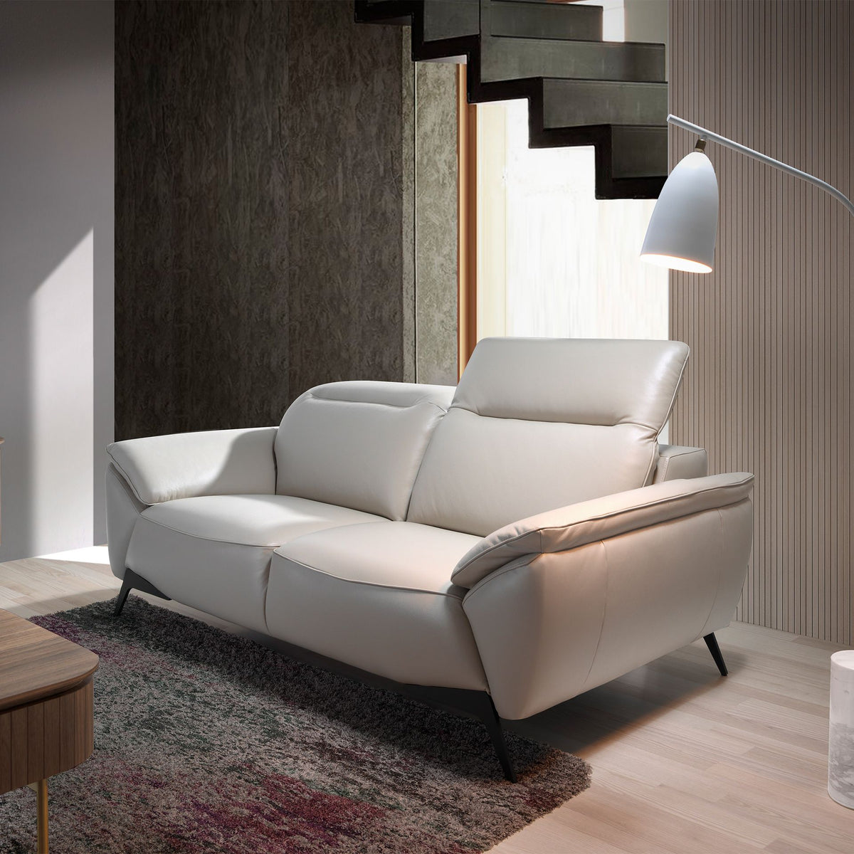 Modern design 2 seater sofa upholstered in taupe grey cowhide leather with headrest to ensure greater comfort. Both for its style and its black stainless steel legs, this sofa will bring the touch of avant-garde and elegance that you are looking for for your home.