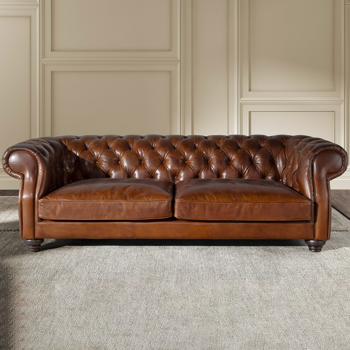 Chester 3 seater sofa with a modern design upholstered in cognac brown cowhide leather. Both for its style and its solid wood legs stained in mahogany colour, this sofa will bring a touch of avant-garde and elegance that you are looking for in your home.
