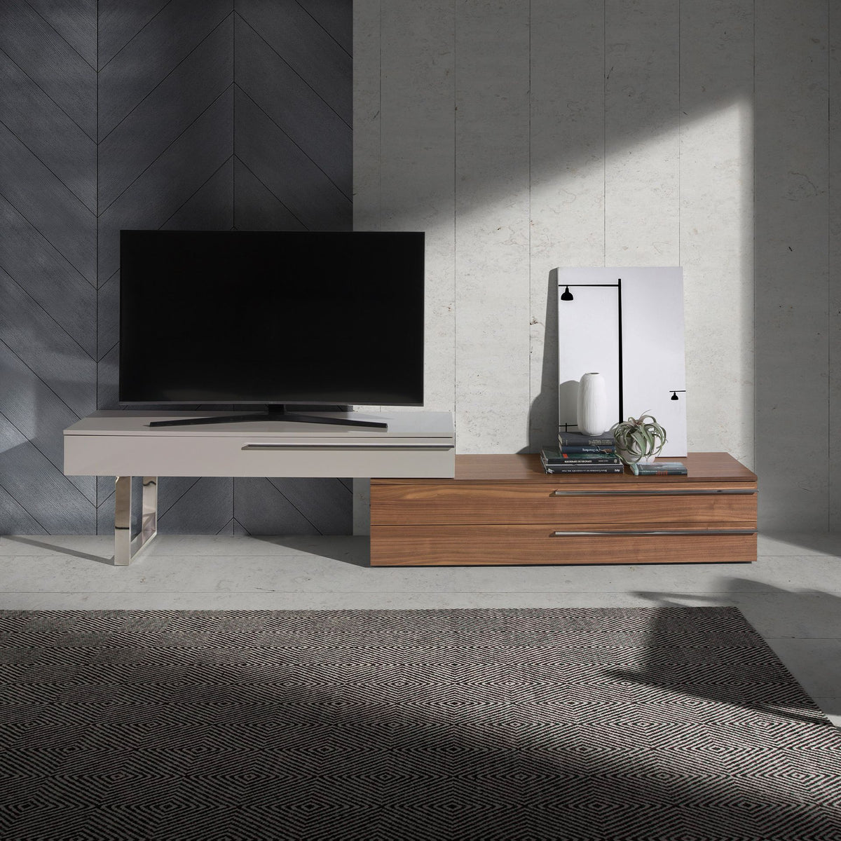 Modern design TV standwith naturalwalnut veneered woodstructure andoriginal chromed stainless steellegs. Its originalbeige MDF wood detailadds the perfect touch of style to your living room. It has alarge storage spacewith3 drawerswithpull-tab opening systemandsoft-closing system.