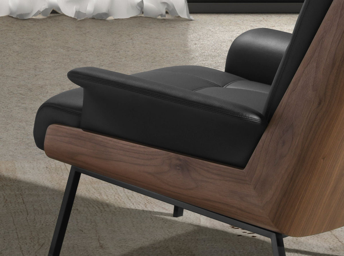Armchair with modern design armrestswith seat and backrest upholstered inblack leatherette. Both for itsnatural walnut veneered wooddetails and itsblack stainless steel legs, this armchair is the perfect combination between design and comfort.