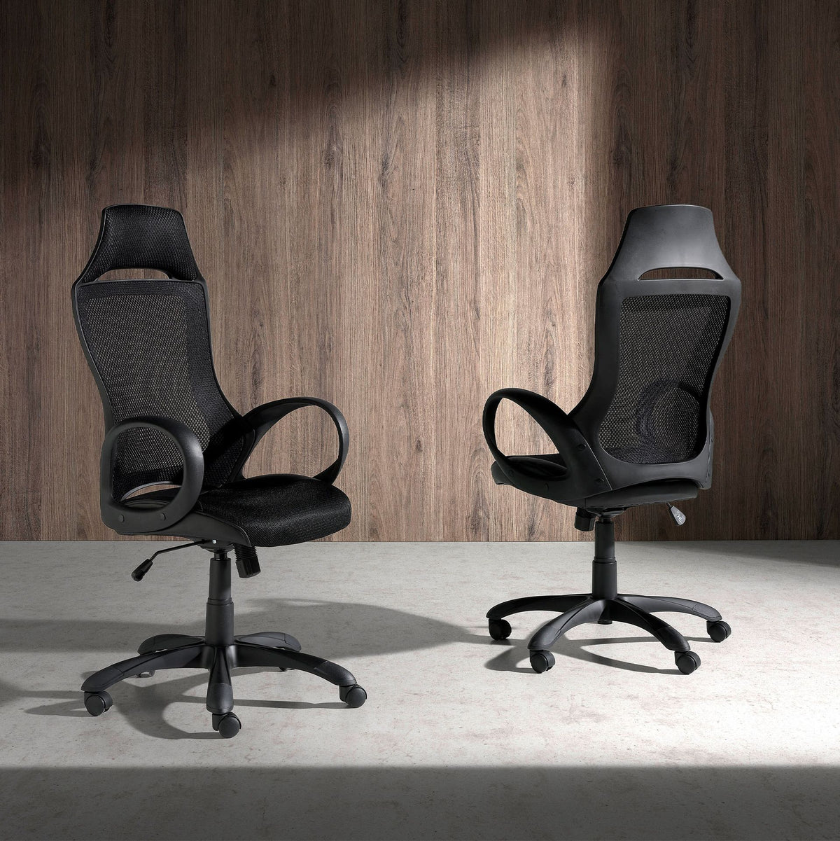 Modern design swivel office chair with seat and backrest upholstered in black fabric. It has armrests, which makes it more comfortable. Thanks to its legs made of black pvc and its height adjustable seat, it will become an essential for your work area, without leaving aside the most avant-garde style. Its castors will provide the extra practicality you need for your work or study hours.
