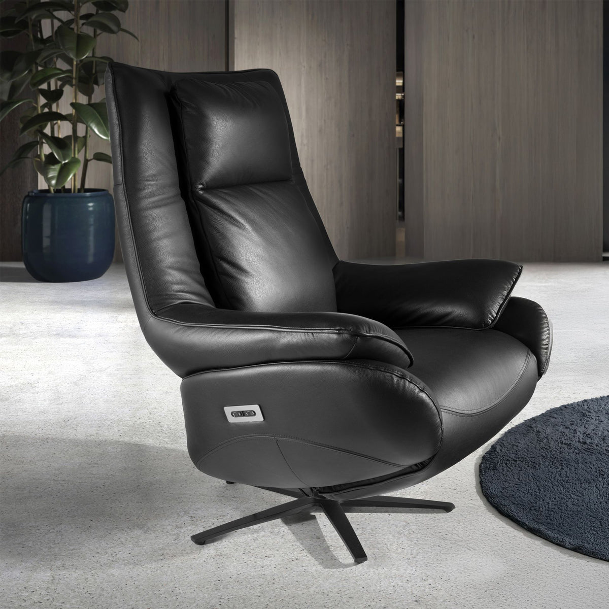 Swivel armchair with armrests of modern designwith seat and backrest upholstered inblack cowhide leather. Both for its style and itsblack epoxy painted stainless steellegs, thisswivel relax armchairwithelectric relax mechanismis ideal to provide the perfect balance between style and comfort.