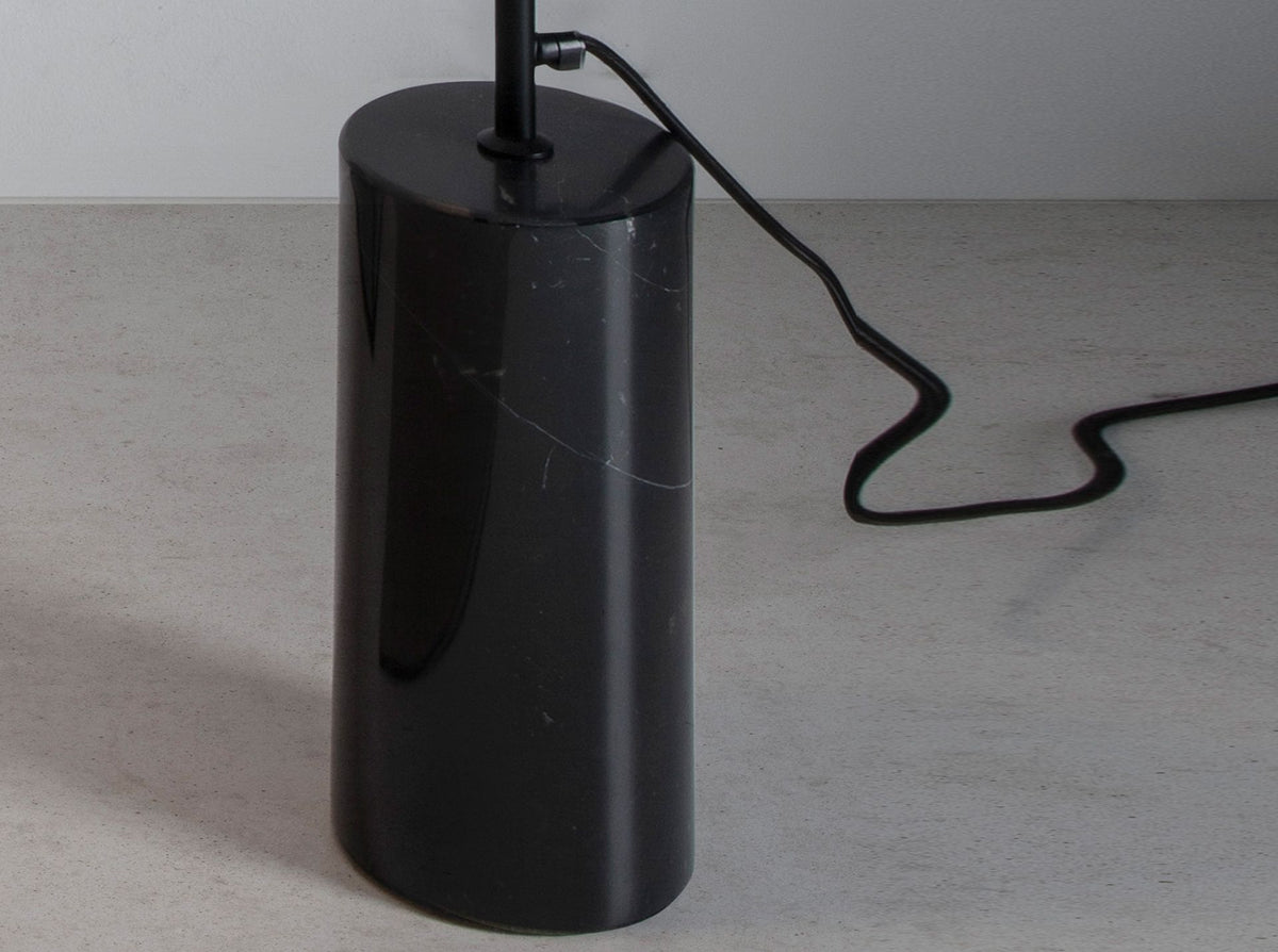 Floor lampwith similar nero marquina porcelain marble base. Directional lampshade. Body and shade inblack stainless steel.