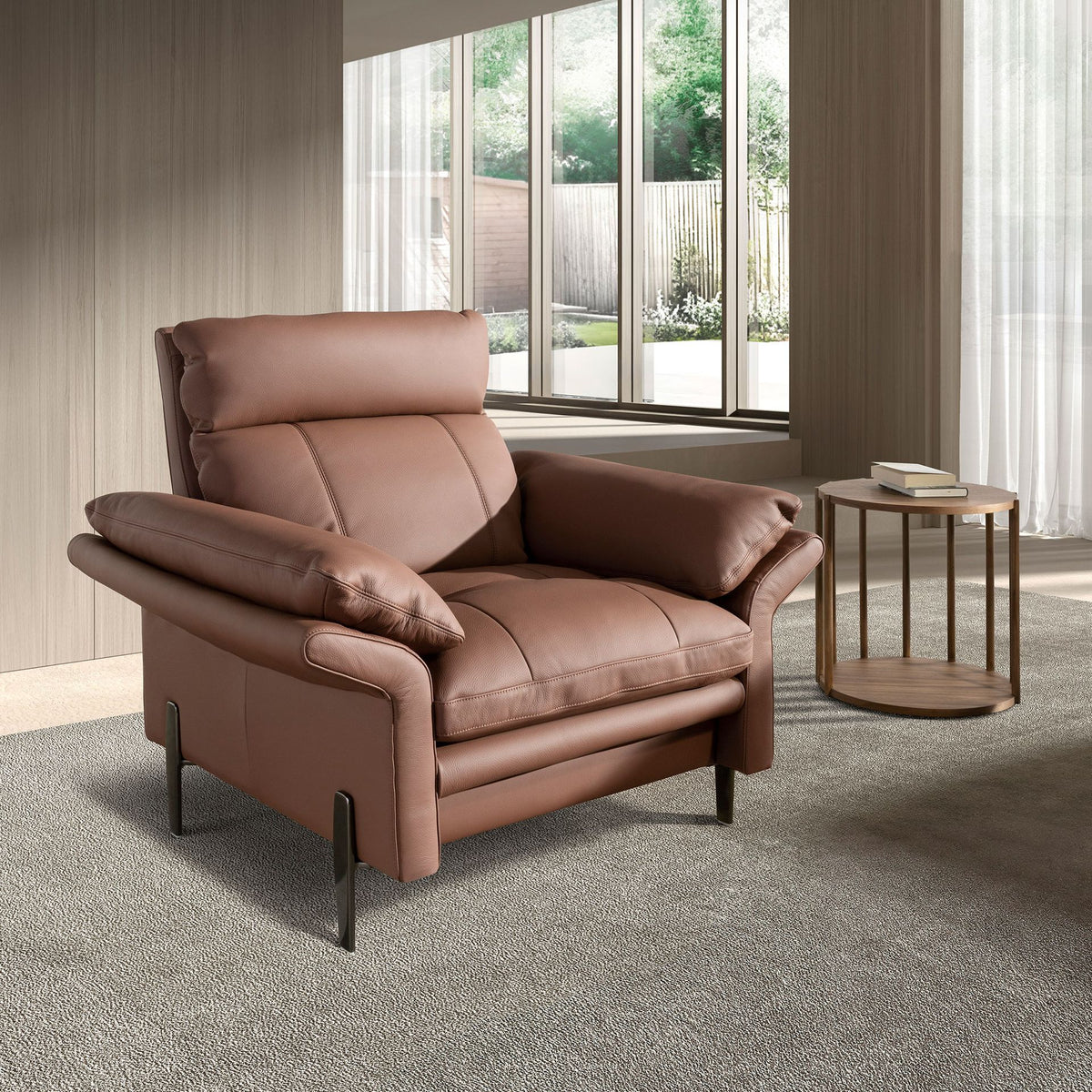 Armchair with modern design armrestswith seat and backrest upholstered inbrown cowhide leather. Both for its style and itsdark chromed stainless steellegs, this armchair is the perfect combination of design and comfort.