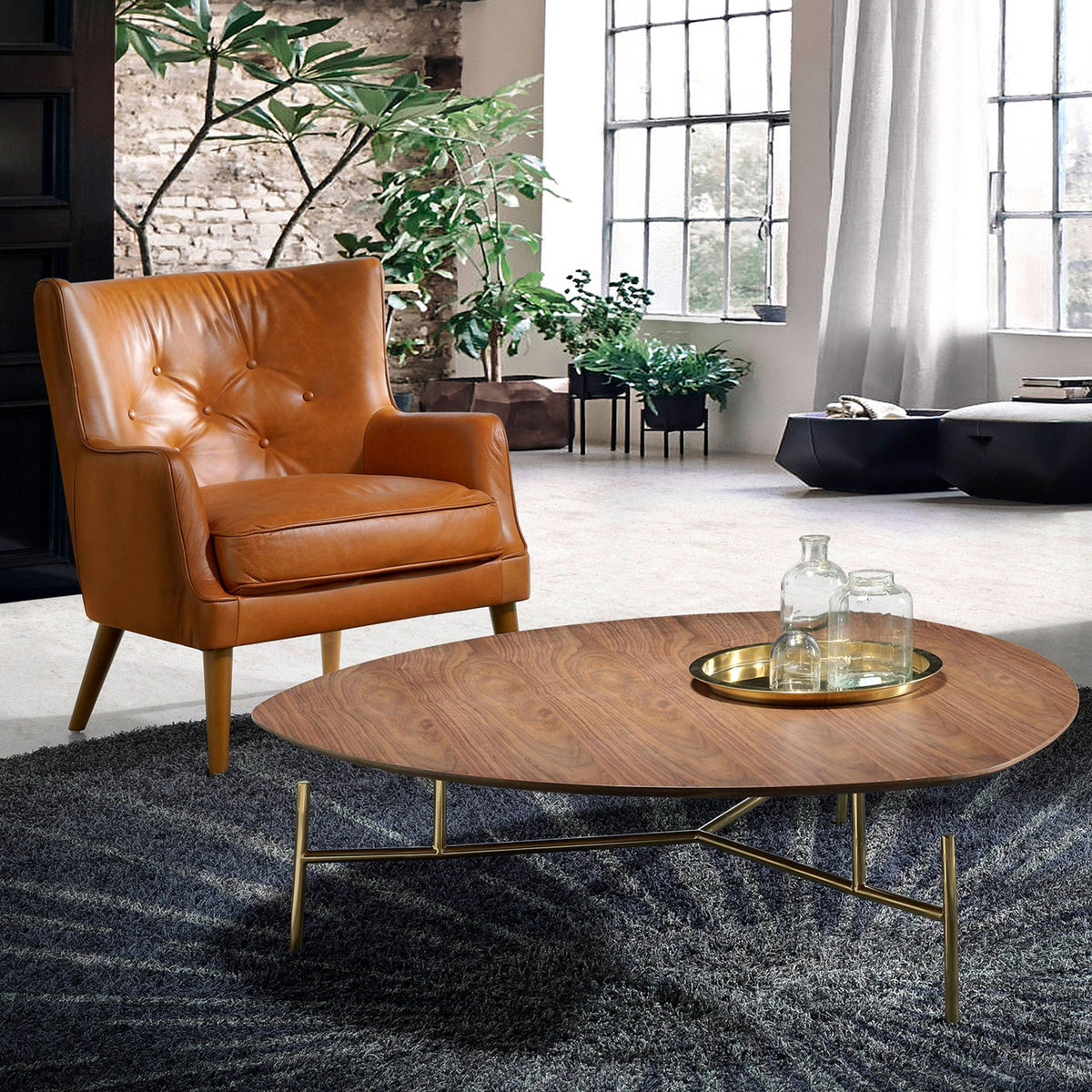 Chester armchair with modern design armrestsupholstered inbrown cowhide leather. Achester armchairwith an avant-garde yet timeless style, with a structure and legs made ofwalnut-coloured wood, which will become a must-have in your living room.