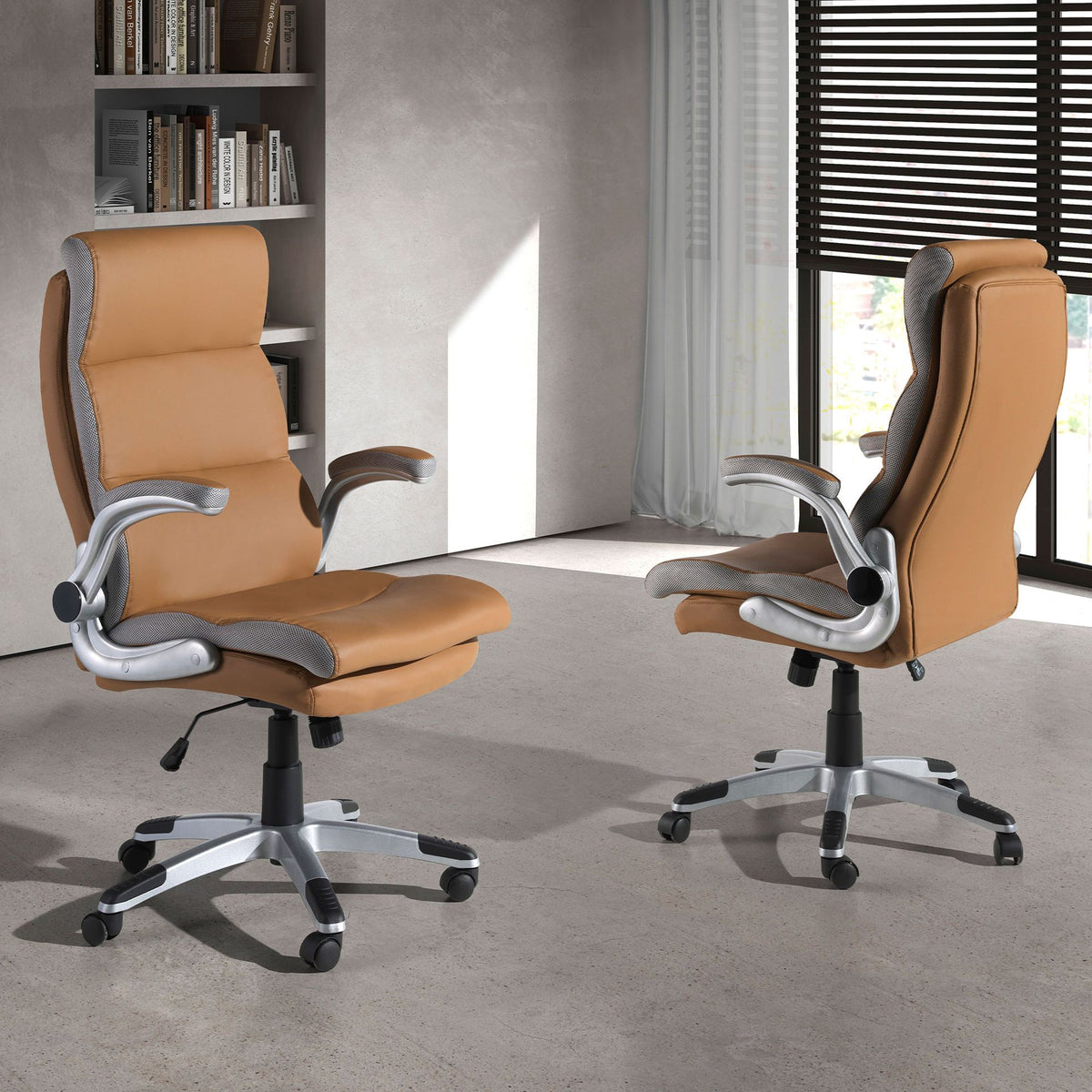 Swivel office chair with a modern design with seat and backrest upholstered in brown leatherette. It has armrests, which makes it more comfortable. Thanks to its legs made of metal grey pvc and its height adjustable seat, it will become an essential for your work area, without leaving aside the most avant-garde style. Its castors will provide the extra practicality you need for your work or study hours.