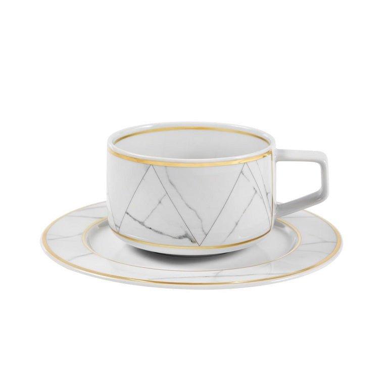 Introducing the Tea Cup & Saucer Carrara, a sophisticated addition to your porcelain collection, beautifully crafted with designs inspired by the noble Carrara marble. This refined geometric approach not only enhances the aesthetic appeal but also creates an illusion of interchangeability among the pieces.
